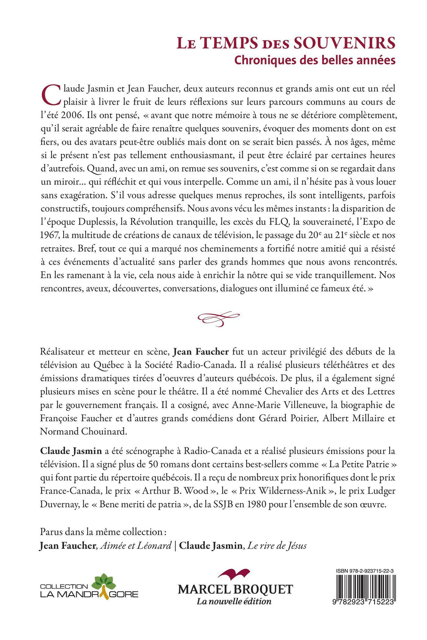 Claude Jasmin et Jean Faucher, deux auteurs reconnu et grands amis ont eut un réel plaisir à livrer le fruit de leurs réflexions sur leurs parcours communs au cours de l'été 2006. Ils ont pensé, « avant que notre mémoire à tous ne se détériore complètement, qu'il serait agréable de faire renaître quelques souvenirs, évoquer des moments dont on est fiers, ou des avatars peut-être oubliés mais dont on se serait bien passés. À nos âges, même si le présent n'est pas tellement enthousiasmant, il peut être éclairé par certaines heures d'autrefois. Quand, avec un ami, on remue ses souvenirs, c'est comme si on se regardait dans un miroir? qui réfléchit et qui vous interpelle. Comme un ami, il n'hésite pas à vous louer sans exagération. S'il vous adresse quelques menus reproches, ils sont intelligents, parfois constructifs, toujours compréhensifs. Nous avons vécu les mêmes instants : la disparition de l'époque Duplessis, la révolution tranquille, les excès du FLQ, la souveraineté, l'Expo de 1967, la multitude de créations de canaux de télévision, le passage du 20e au 21e siècle et nos retraites. Bref, tout ce qui a marqué nos cheminements a fortifié notre amitié qui a résisté à ces événements d'actualité sans parler des grands hommes que nous avons rencontrés. En les ramenant à la vie, cela nous aide à enrichir la nôtre qui se vide tranquillement. Nos rencontres, aveux, découvertes, conversations, dialogues ont illuminé ce fameux été.