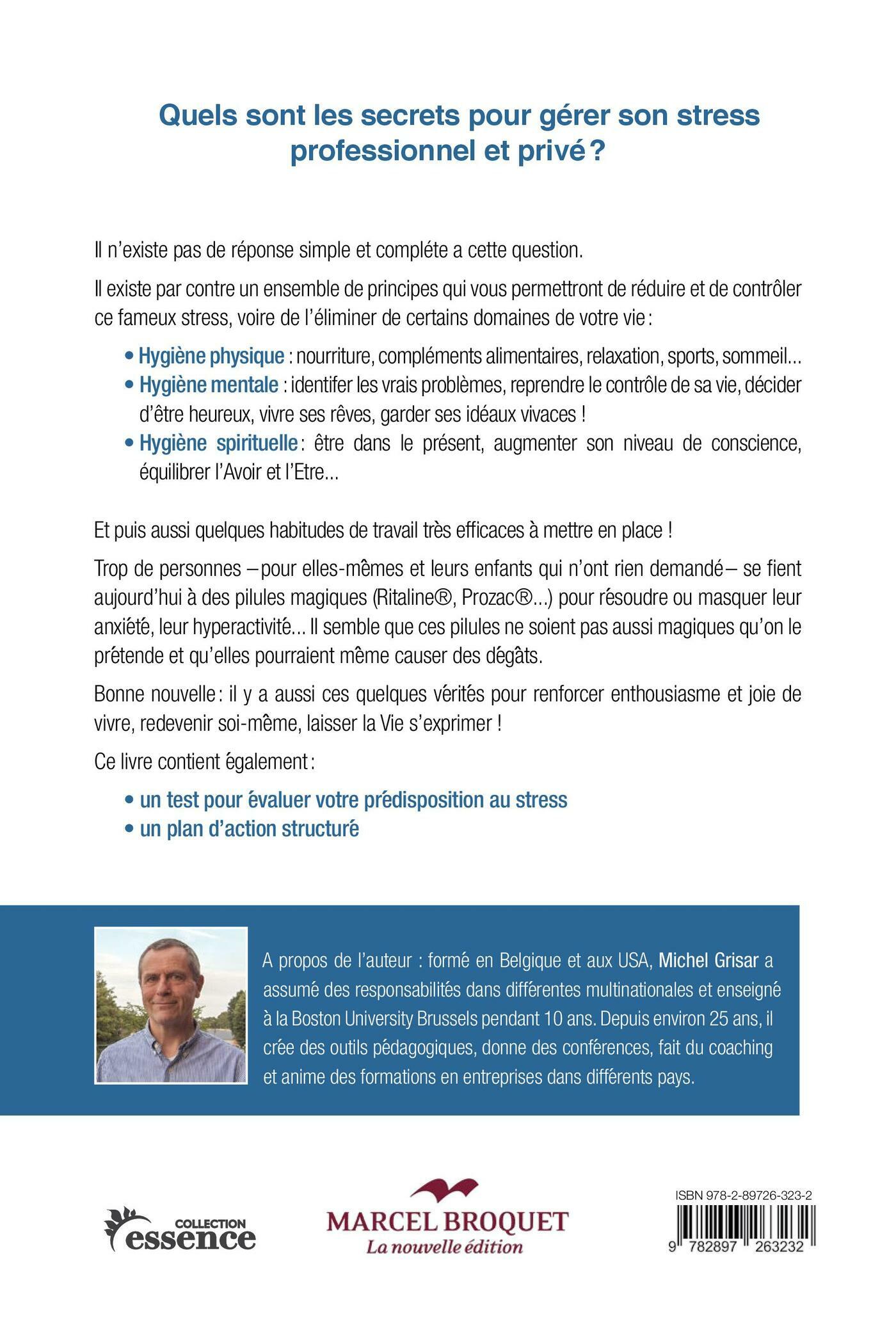 Quels sont les secrets pour gérer son stressprofessionnel et privé ?Il n’existe pas de réponse simple et complète à cette question.Il existe par contre un ensemble de principes qui vous permettront de réduire etde contrôler ce fameux stress, voire de l’éliminer de certains domaines de votre vie :• Hygiène physique : nourriture, compléments alimentaires, relaxation, sports,sommeil...• Hygiène mentale : identifer les vrais problèmes, reprendre le contrôle de sa vie,décider d’être heureux, vivre ses rêves, garder ses idéaux vivaces !• Hygiène spirituelle : être dans le présent, augmenter son niveau de conscience,équilibrer l’Avoir et l’Etre...Et puis aussi quelques habitudes de travail très efficaces à mettre en place !Trop de personnes – pour elles-mêmes et leurs enfants qui n’ont rien demandé –se fient aujourd’hui à des pilules magiques (Ritaline®, Prozac®...) pour résoudreou masquer leur anxiété, leur hyperactivité... Il semble que ces pilules ne soient pas aussi magiques qu’on le prétende et qu’elles pourraient même causer des dégâts.Bonne nouvelle : il y a aussi ces quelques vérités pour renforcer enthousiasme etjoie de vivre, redevenir soi-même, laisser la Vie s’exprimer !Ce livre contient également :• un test pour évaluer votre prédisposition au stress• un plan d’action structuré