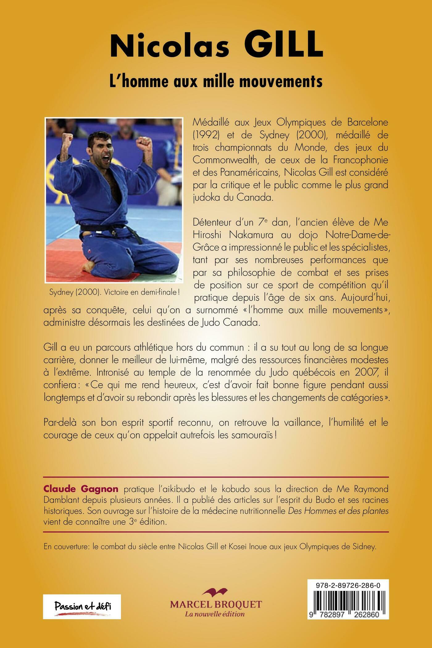 Médaillé aux Jeux Olympiques de Barcelone(1992) et de Sydney (2000), médaillé à trois championnats du Monde, aux jeux duCommonwealth, ceux de la Francophonieet les Panaméricains, Nicolas Gill estconsidéré par la critique et le public commele plus grand judoka du Canada.Détenteur d’un 7e dan, l’ancien élève de Me Hiroshi Nakamura au dojo Notre-Dame-de-Grâce a impressionné le publicet les spécialistes par ses nombreusesperformances mais tout autant par saphilosophie de combat et ses prises depositions sur son sport de compétitionqu’il pratique depuis l’âge de six ans.Aujourd’hui, après sa conquête, celuiqu’on a surnommé « l’homme aux millemouvements », administre désormais les destinées de Judo Canada.Gill a eu un parcours athlétique hors du commun : il a su tout au long de salongue carrière faire le meilleur avec des ressources financières modestes àl’extrême. Intronisé au temple de la renommée du Judo québécois en 2007,il confiera : « Ce qui me rend heureux, c’est d’avoir fait bonne figure pendantaussi longtemps et d’avoir su rebondir après les blessures et les changementsde catégories ».Par-delà son bon esprit sportif reconnu, on retrouve la vaillance, l’humilité et lecourage de ceux qu’on appelait autrefois les samouraïs !
