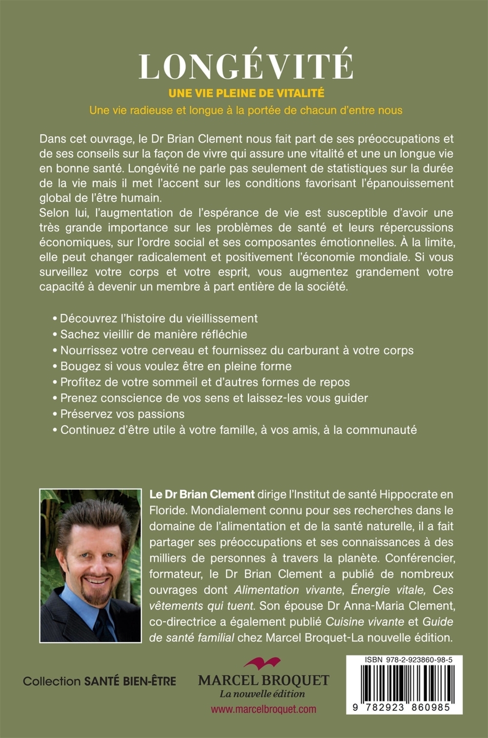 Une vie radieuse et longue à la portée de chacun d’entre nous.Dans cet ouvrage, le Dr Brian Clement nous fait part de ses préoccupations et de ses conseils sur la façon de vivre qui assure une vitalité et une longévité. Longévité ne parle pas seulement de statistiques sur la durée de la vie mais il met l’accent sur les conditions favorisant l’épanouissement global de l’être humain.Selon lui, l’augmentation de l’espérance de vie est susceptible d’avoir une très grande importance sur les problèmes de santé et leurs répercussions économiques, sur l’ordre social et ses composantes émotionnelles. À la limite, elle peut changer radicalement et positivement l’économie mondiale. Si vous surveillez votre corps et votre esprit, vous augmentez grandement votre capacité à devenir un membre à part entière de la société.Découvrez l’histoire du vieillissementSachez vieillir de manière réfléchieNourrissez votre cerveau et fournissez du carburant à votre corpsBougez si vous voulez être en pleine formeProfitez de votre sommeil et d’autres formes de reposPrenez conscience de vos sens et laissez-les vous guiderPréservez vos passionsContinuez d’être utile à votre famille, à vos amis, à la communauté