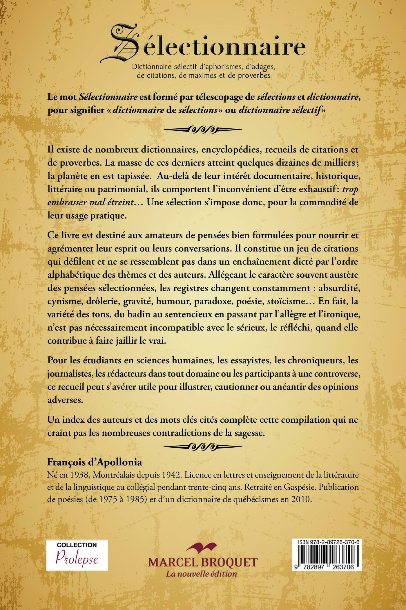 Il existe de nombreux dictionnaires, encyclopédies, recueils de citations et de proverbes. La masse de ces derniers atteint quelques dizaines de milliers ; la planète en est tapissée. Au-delà de leur Intérêtdocumentaire, historique, littéraire ou patrimonial, ils comportent des inconvénients. Et non des moindresest de trop embrasser… Une sélection s’impose donc, pour la commodité de leur usage pratique.Ce livre est destiné aux amateurs de pensées bien formulées pour nourrir et agrémenter leur esprit ou leurs conversations. Il constitue un jeu de citations qui défilent et ne se ressemblent pas dans un enchaînement dicté par l’ordre alphabétique des thèmes et des auteurs. Allégeant le caractère souvent austère des pensées sélectionnées, les registres changent constamment : absurdité,cynisme, drôlerie, gravité, humour, paradoxe, poésie, stoïcisme… En fait, la variété des tons, du badin au sentencieux en passant par l’allègre et l’ironique, n’est pas nécessairement incompatible avec le sérieux, le réfléchi, quand elle contribue à faire jaillir le vrai.Pour les étudiants en sciences humaines, les essayistes, les chroniqueurs, les journalistes, les rédacteurs dans tout domaine ou les participants à une controverse, ce recueil peut s’avérer utile pour Illustrer, cautionner ou anéantir des opinions adverses.Un index des auteurs et des mots clés cités complète cette compilation qui ne craintpas les nombreuses contradictions de la sagesse.
