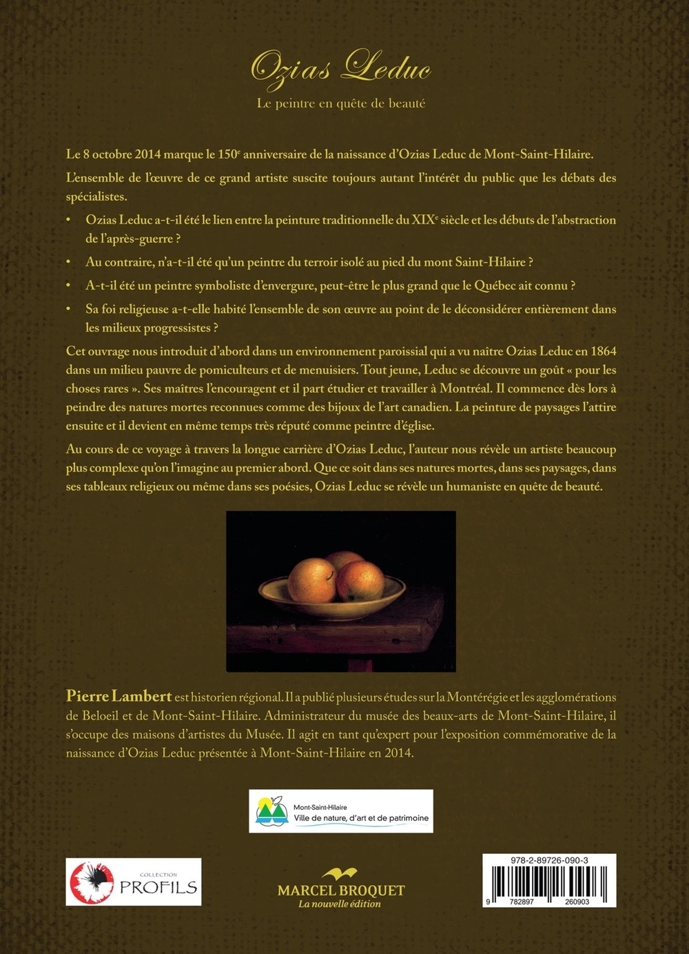 Le 8 octobre 2014 marque le 150e anniversaire de la naissance du peintre Ozias Leduc de Mont-Saint-Hilaire. L’ensemble de l’oeuvre de ce grand artiste suscite toujours autant l’intérêt du public de même que les débats de spécialistes.• Ozias Leduc a-t-il été le lien entre la peinture traditionnelle du XIXe siècle et les débuts de l’abstraction de l’après-guerre ?• Au contraire, n’a-t-il été qu’un peintre du terroir isolé au pied du mont Saint-Hilaire ?• A-t-il été un peintre symboliste d’envergure, peut-être le plus grand que le Québec ait connu?• Sa foi religieuse a-t-elle habité l’ensemble de son oeuvre au point de le déconsidérer entièrement dans les milieux progressistes? Cet ouvrage nous introduit d’abord dans un environnement paroissial qui a vu naître Ozias Leduc en 1864, un milieu pauvre de pomiculteurs et de menuisiers. C’est là que, tout jeune, Leduc se découvre un goût « pour les choses rares ». Ses maîtres l’encouragent et il part étudier et travailler à Montréal. Il commence dès lors à peindre des natures mortes reconnues comme des bijoux de l’art canadien. La peinture de paysages l’attire ensuite et il devient très réputé comme peintre d’église. Au cours de ce voyage à travers la longue carrière d’Ozias Leduc, l’auteur nous révèle un artiste beaucoup plus complexe qu’on l’imaginait au premier abord. Que ce soit dans ses natures mortes, dans ses paysages, dans ses tableaux religieux ou même dans sespoésies, Ozias Leduc se fait humaniste en quête de beauté.