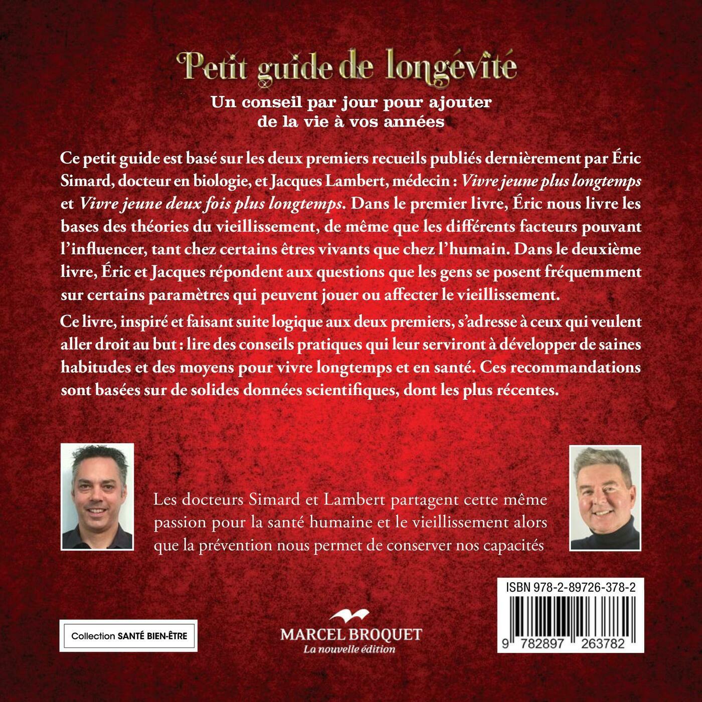 Ce petit guide est basé sur les deux premiers recueils publiés dernièrement par Éric Simard, docteur en biologie, et JacquesLambert, médecin : Vivre jeune pluslongtemps et Vivre jeune deux fois plus longtemps. Dans le premier livre, Éric nous livre les bases des théories du vieillissement, de même que les différents facteurs pouvant l’influencer, tant chez certains êtres vivants que chez l’humain.Dans le deuxième livre, Éric et Jacquesrépondent aux questions que les gensse posent fréquemment sur certainsparamètres qui peuvent jouer ou affecterle vieillissement.Ce livre, inspiré et faisant suite logique aux deux premiers, s’adresse à ceux qui veulent aller droit au but : lire des conseils pratiques qui leur serviront à développer de saines habitudes et des moyens pour vivre longtemps et en santé. Ces recommandations sont basées sur de solides données scientifiques, dont les plus récentes.Vous y trouverez des énoncés, des statistiques, des citations, ou desrecommandations, condensés et non équivoques, sur les façons de bien vieillir en santé, en déjouant autant que possible les écueils qui peuvent survenir sur la route de la vie. Certains d’entre eux vous parleront davantage que d’autres. Et au bout du compte vous y trouverez une multitude de trucs pour conserver la santé, pour passer à travers la vie le mieux possible, maissurtout pour la vivre pleinement et le plus longtemps possible.
