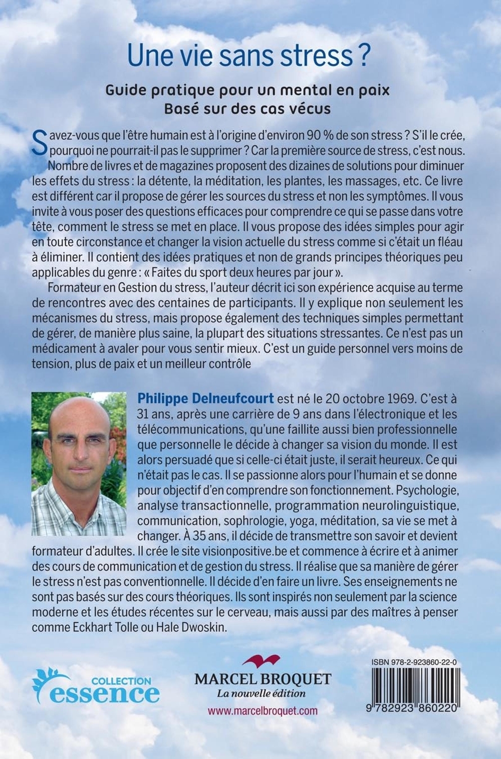 Savez-vous que l'être humain est à l’origine d’environ 90% de son stress ? S'il le crée, pourquoi ne pourrait-il pas le supprimer ? Car la première source de stress, c’est nous.Nombre de livres et de magazines proposent des dizaines de solutions pour diminuer les effets du stress : la détente, la méditation, les plantes, les massages, etc. Ce livre est différent car il propose de gérer les sources du stress et non les symptômes. Il vous invite à vous poser des questions efficaces pour comprendre ce qui se passe dans votre tête, comment le stress se met en place. Il vous propose des idées simples pour agir en toute circonstance et changer la vision actuelle du stress comme si c’était un fléau à éliminer. Il contient des idées pratiques et non de grands principes théoriques peu applicables du genre : « Faites du sport 2 heures par jour ».Formateur en Gestion du stress, l’auteur cerne ici, son expérience acquise au terme de rencontres de groupes de centaines de participants. Il y explique non seulement les mécanismes du stress mais propose également des techniques simples permettant de gérer, de manière plus saine, la plupart des situations stressantes. Ce n’est pas un médicament à avaler pour vous sentir mieux. C’est un guide personnel vers moins de tension, plus de paix et un meilleur contrôle