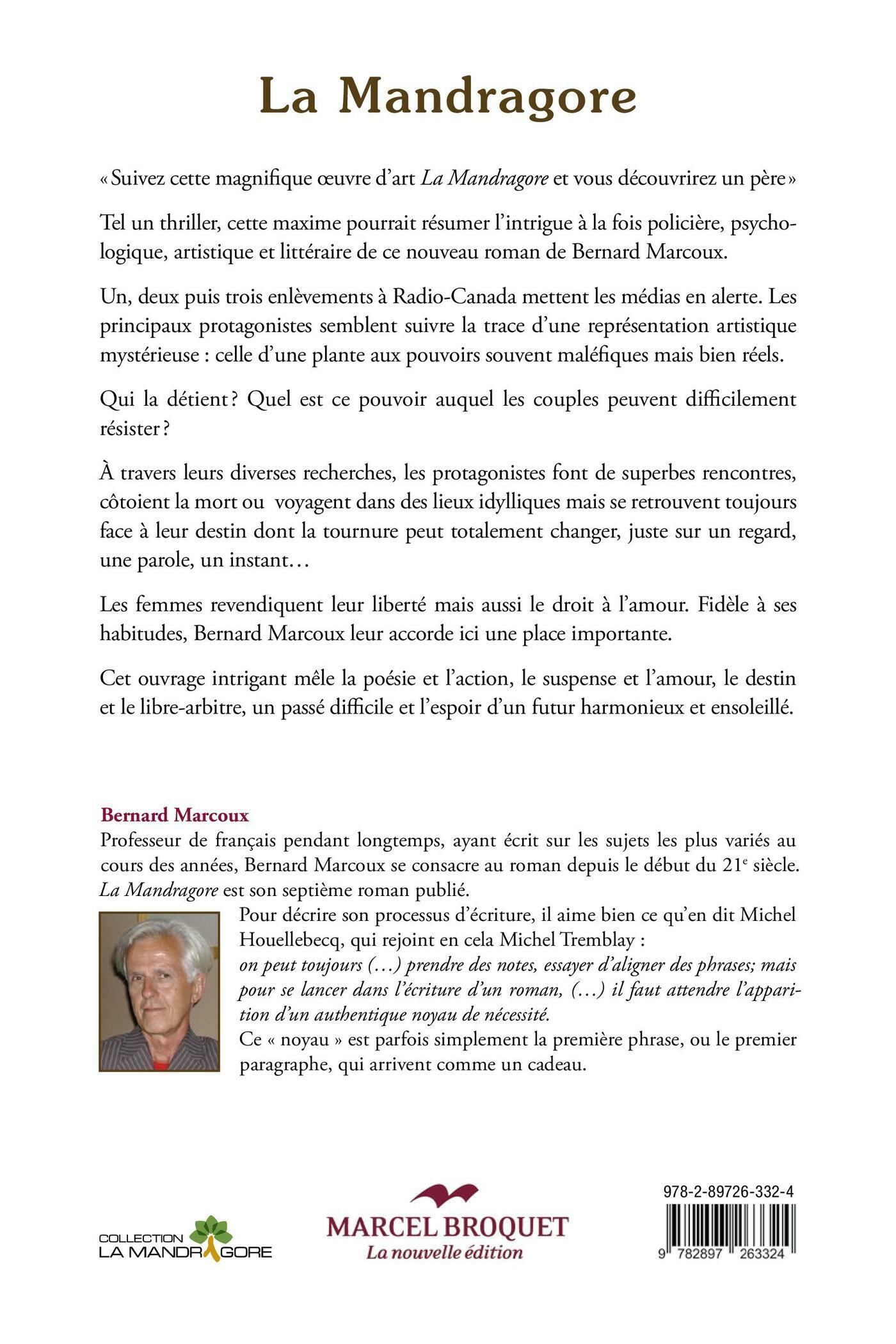 Les romans de Bernard Marcoux sont depuis toujours habités par des femmes : Ève, Béatrice, Marie, Chantal, Odile, toutes modernes, libres, autonomes.Voici, avec un septième roman, La Mandragore, une autre histoire de femmes : Olga, Charlotte, Nathalie, Agathe, de la même trempe, inévitablement blessées, néanmoins courageuses, tenaces, vibrantes,toujours du côté de la vie.Le début de La Mandragore est comme un prologue, un vestibule, où le lecteur fait la connaissance de trois personnages. Puis, unfait divers met l’histoire en branle : un présentateur de nouvelles de Radio-Canada est enlevé, et un deuxième, et un troisième. Par qui ?Pourquoi ?La Mandragore, mêlant intrigue policière, art, littérature, amour et mort, vous emmènera jusqu’aux Îles-de-la-Madeleine (Serait-ce la paradis ? se demandent certains personnages). Elle vous raconteracet instant d’une ancienne vie, qui tient quelquefois dans un seul mot, et les occasions que le destin nous offre parfois de le revivre, de lui donner une autre couleur, une autre vibration, un autre sens, pourrétablir ainsi l’harmonie et recréer le bonheur.