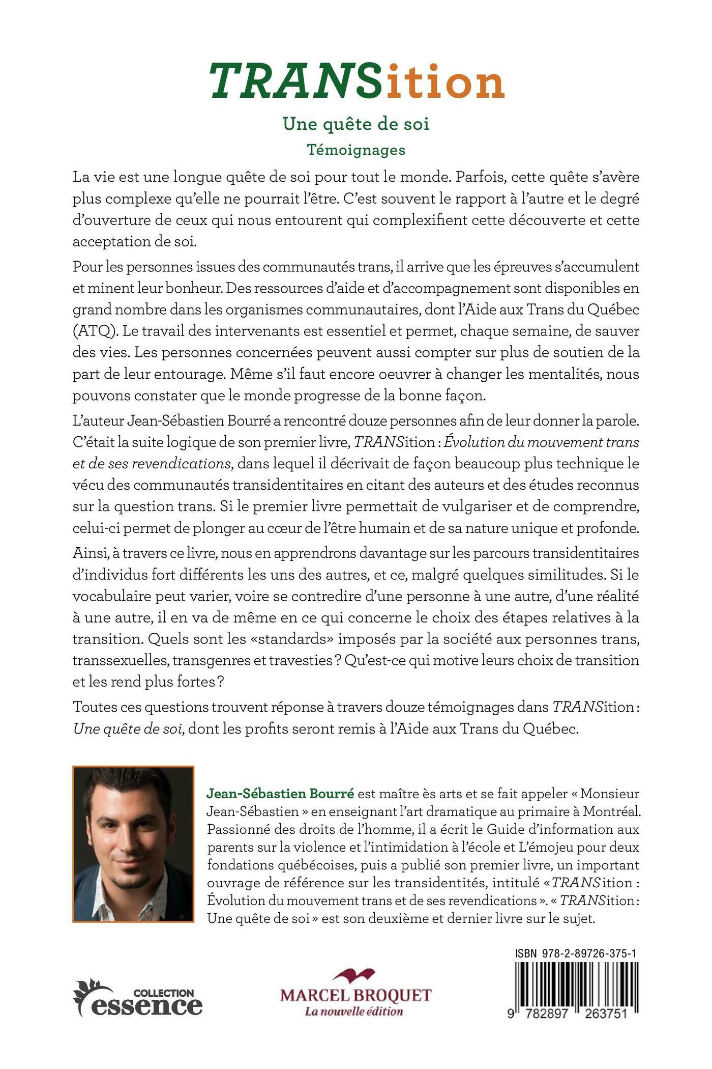 La vie est une longue quête de soi pour tout le monde. Parfois, cette quête s’avèreplus complexe qu’elle ne pourrait l’être. C’est souvent le rapport à l’autre et le degréd’ouverture de ceux qui nous entourent qui complexifient cette découverte et cetteacceptation de soi.Pour les personnes issues des communautés trans, il arrive que les épreuvess’accumulent et minent leur bonheur. Des ressources d’aide et d’accompagnementsont disponibles en grand nombre dans les organismes communautaires, dont l’Aideaux Trans du Québec (ATQ). Le travail des intervenants est essentiel et permet, chaquesemaine, de sauver des vies. Les personnes concernées peuvent aussi compter surplus de soutien de la part de leur entourage. Même s’il faut encore oeuvrer à changerles mentalités, nous pouvons constater que le monde progresse de la bonne façon.L’auteur Jean-Sébastien Bourré a rencontré onze personnes afin de leur donner la parole.C’était la suite logique de son premier livre, TRANSition : Évolution du mouvement transet de ses revendications, dans lequel il décrivait de façon beaucoup plus technique levécu des communautés transidentitaires en citant des auteurs et des études reconnussur la question trans. Si le premier livre permettait de vulgariser et de comprendre,celui-ci permet de plonger au coeur de l’être humain et de sa nature unique et profonde.Ainsi, à travers ce livre, nous en apprendrons davantage sur les parcours transidentitairesd’individus fort différents les uns des autres, et ce, malgré quelques similitudes. Si levocabulaire peut varier, voire se contredire d’une personne à une autre, d’une réalitéà une autre, il en va de même en ce qui concerne le choix des étapes relatives à latransition. Quels sont les «standards» imposés par la société aux personnes trans,transsexuelles, transgenres et travesties? Qu’est-ce qui motive leurs choix de transitionet les rend plus fortes?Toutes ces questions trouvent réponse à travers onze témoignages dans TRANSition: Une quête de soi, dont les profits seront remis à l’Aide aux Trans du Québec.