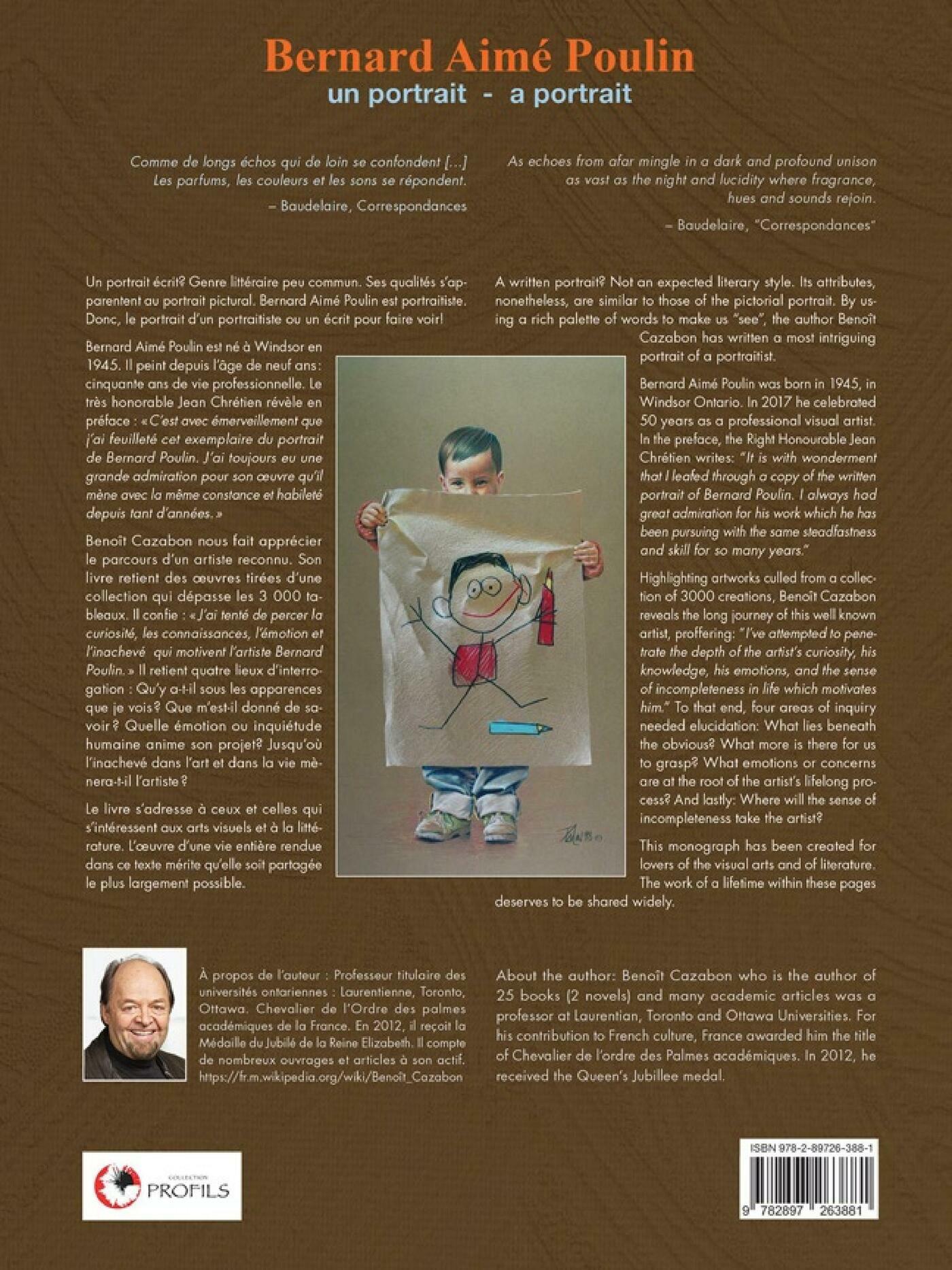 Un portait écrit? Genre littéraire, il emprunte ses qualités au portrait pictural. Parmi les genres de peinture que le peintre Bernard Aimé Poulin privilégie, il y a le portrait.Donc, le portrait d’un portraitiste. En quelque sorte, un écrit pour faire voir ! Tout au long de ses 50 ans de carrière, Poulin présente des thématiques aussi variées que sa palette est riche. Le livre fait ressortir ses portraits de gens illustres, mais aussi ceux d’enfants, d’hommes et de femmes. L’enfant capté dans sa créativité, ses émotions, sa capacité de contempler ou de s’étonner. Vous verrez des pièces attendrissantes touchant la santé de l’enfant. Bernard fut un grand mécène auprès des institutions vouées aux enfantsdans le besoin.Benoît Cazabon nous donne à apprécier le parcours d’un artiste reconnu en posant desquestions sur son engagement. Son livre retient de nombreuses oeuvres tirées d’une collection qui dépasse 3000 tableaux. Il dit : «J’ai tenté de percer la curiosité, les connaissances, l’émotion et l’inachevé qui motivent l’artiste Bernard Poulin.»Poulin se démarque par sa qualité d’observateur. Enfant, il était frustré que son pinceau ne reproduise pas ce que son oeil voyait. Sa persévérance eut gain de cause. À votre tour d’exercer vos talents d’observateur et d’apprécier de belles pièces : nature morte, paysage urbain, mers et eaux, que ce soit au Canada, en Italie, en France ou aux Bermudes, vous serez convié au voyage.Dans sa préface, le Très honorable Jean Chrétien déclare : «Je tiens à féliciter l’auteur, Benoît Cazabon et l’artiste Bernard Poulin, pour avoir réuni leurs talents dans cette réalisation de qualité. Je leur souhaite une large diffusion pour que les canadiens et tous ceux et celles qui aiment la peinture puissent se nourrir à la lecture de ce beau livre.»