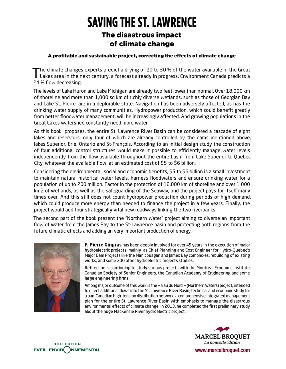 The climate changes experts predict a drying of 20 to 30 % of the water available in the Great Lakes area in the next century, a forecast already in progress. Environment Canada predicts a 24% flow decreasing.the levels of Lake Huron and Lake Michigan are already two feet lower than normal. Over 18,000 km of shoreline and more than 1,000 sq km of richly diverse wetlands, such as those of Georgian Bay and Lake St.Pierre, are in a deplorable state. Navigation has been adversely affected, as has the drinking water supply of many communittes. Hydropower production, which could benefit greatly from better floodwater management, will be increasingly affected. And growing populations in the Great Lakes watershed constantly need more water.As this book proposes, the entire St.Lawrence River Basin can be considered a cascade of eight lakes and reservoirs, only four of which are already controlled by the dams mentioned above, lakes Superior, Erie, Ontario ans St.Francois. According to an initial design study the construction of four additional control structures would make it possible to efficiently manage water levels independtly from the flow available throughout the entire basin from Lake Superior to Quebec City, whatever the vailable flow, at an estimated cost of $5 to $6 billion.Considering the environmental, social and economic benefits, $5 to $6 billion is a small inversment to maintain natural historical water levels, harness floodwaters and ensure drinking water for a population of up to 200 million. Factor in the protection of 18,000 km of shoreline and over 1,000 km2 of wetlands, as well as safeguarding of the Seaway, and the project pays for itself many times over. And this still does not count hydropower production during periods of high demand, which could produce more energy than needed to finance the project in a few years. Finally, the project would add four strategically vital new roadways linking the two riverbanks.The second part of the book present the "Northern Water" project aiming to diverse an important flow of water from the James Bay to the St. Lawrence basin and protecting both regions from the future climatic effects and adding an very important production of energy.
