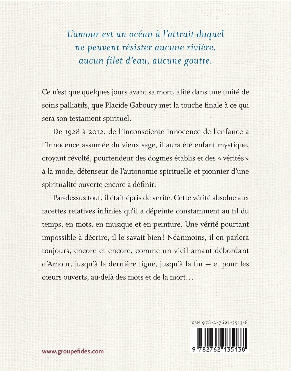 Ce n’est que quelques jours avant sa mort, alité dans une unité de soins palliatifs, que Placide Gaboury met la touche finale à ce qui sera son testament spirituel.De 1928 à 2012, de l’inconsciente innocence de l’enfance à l’Innocence assumée du vieux sage, il aura été enfant mystique, croyant révolté, pourfendeur des dogmes établis et des « vérités » à la mode, défenseur de l’autonomie spirituelle et pionnier d’une spiritualité ouverte encore à définir.Par-dessus tout, il était épris de vérité. Cette vérité absolue aux facettes relatives infinies qu’il a dépeinte constamment au fil du temps, en mots, en musique et en peinture. Une vérité pourtant impossible à décrire, il le savait bien ! Néanmoins, il en parlera toujours, encore et encore, comme un vieil amant débordant d’Amour, jusqu’à la dernière ligne, jusqu’à la fin — et pour les cœurs ouverts, au-delà des mots et de la mort…