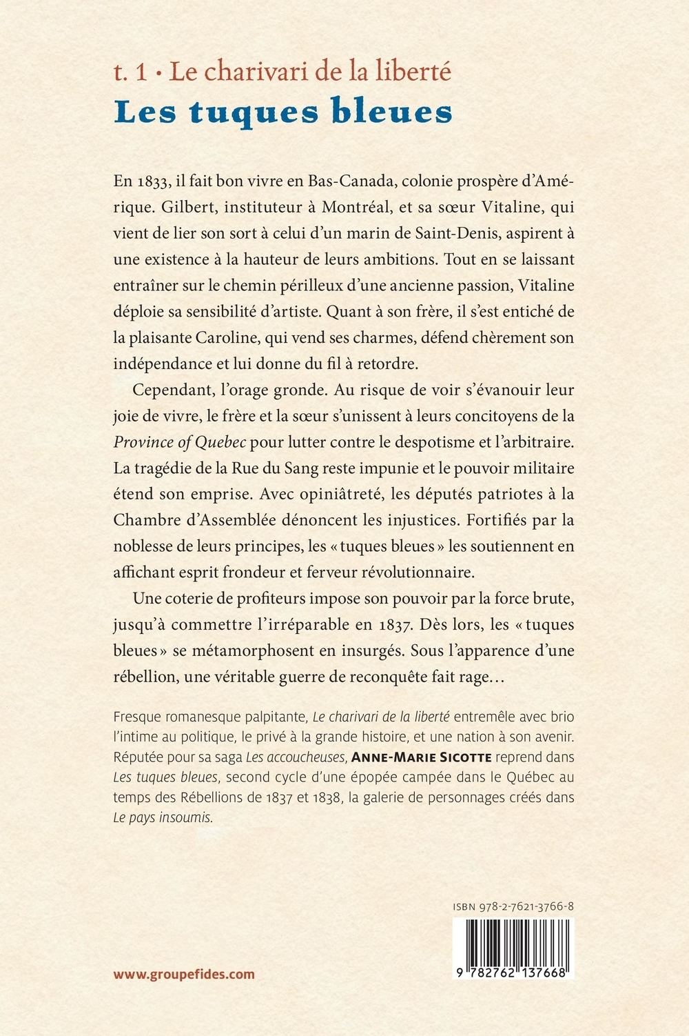 En 1833, il fait bon vivre en Bas-Canada, colonie prospère d’Amérique. Gilbert, instituteur à Montréal, et sa sœur Vitaline, qui vient de lier son sort à celui d’un marin de Saint-Denis, aspirent à une existence à la hauteur de leurs ambitions. Tout en se laissant entraîner sur le chemin périlleux d’une ancienne passion, Vitaline déploie sa sensibilité d’artiste. Quant à son frère, il s’est entiché de la plaisante Caroline, qui vend ses charmes, défend chèrement son indépendance et lui donne du fil à retordre.Cependant, l’orage gronde. Au risque de voir s’évanouir leur joie de vivre, le frère et la sœur s’unissent à leurs concitoyens de la Province of Quebec pour lutter contre le despotisme et l’arbitraire. La tragédie de la Rue du Sang reste impunie et le pouvoir militaire étend son emprise. Avec opiniâtreté, les députés patriotes à la Chambre d’Assemblée dénoncent les injustices. Fortifiés par la noblesse de leurs principes, les «tuques bleues» les soutiennent en affichant esprit frondeur et ferveur révolutionnaire.Une coterie de profiteurs impose son pouvoir par la force brute, jusqu’à commettre l’irréparable en 1837. Dès lors, les « tuques bleues » se métamorphosent en insurgés. Sous l’apparence d’une rébellion, une véritable guerre de reconquête fait rage…Fresque romanesque palpitante, Le charivari de la liberté entremêle avec brio l’intime au politique, le privé à la grande histoire, et une nation à son avenir. Réputée pour sa saga Les accoucheuses, Anne-Marie Sicotte reprend dans Les tuques bleues, second cycle d’une épopée campée dans le Québec au temps des Rébellions de 1837 et 1838, la galerie de personnages créés dans Le pays insoumis.Plus amples renseignements sont disponibles à www.amsicotte.com.