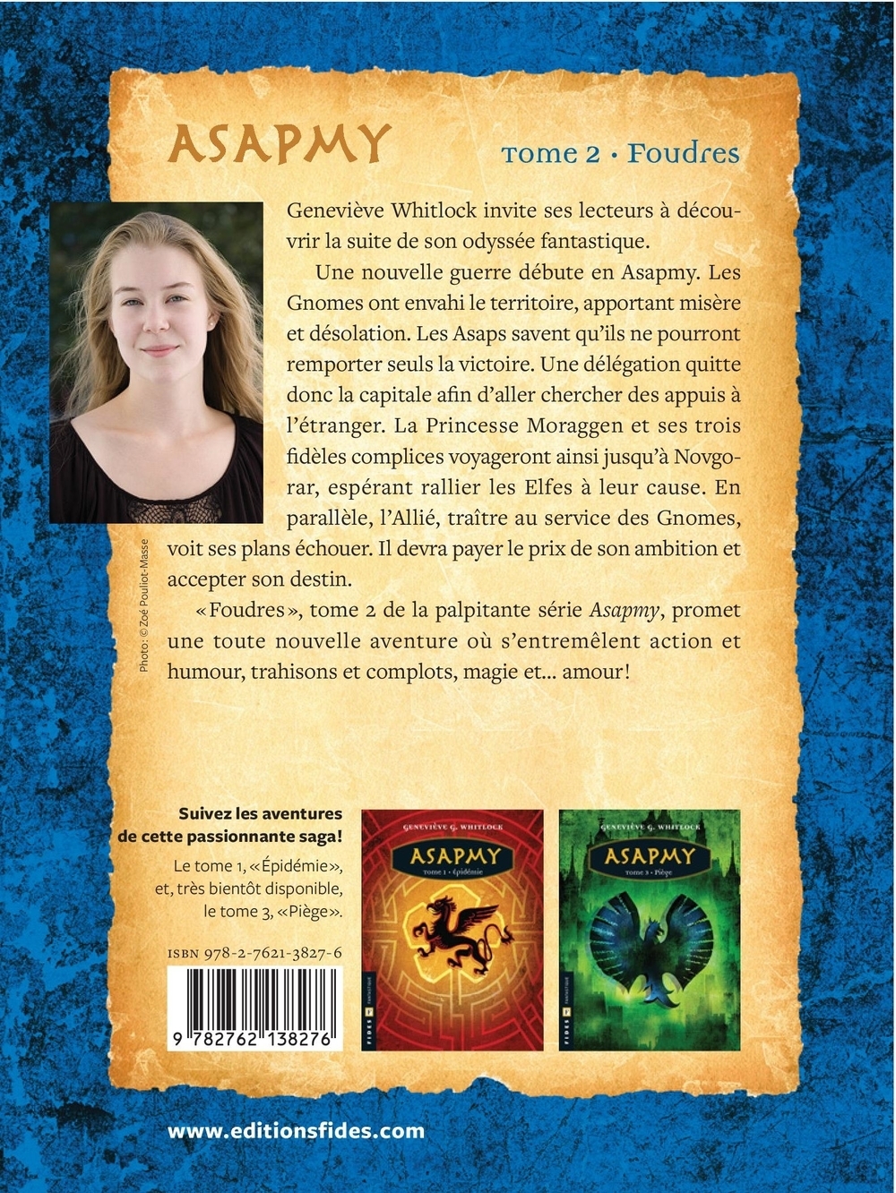 Geneviève Whitlock invite ses lecteurs à découvrir la suite de son odyssée fantastique.Une nouvelle guerre débute en Asapmy. Les Gnomes ont envahi le territoire, apportant misère et désolation. Les Asaps savent qu'ils ne pourront remporter seuls la victoire. Une délégation quitte donc la capitale afin d'aller chercher des appuis à l'étranger. La Princesse Moraggen et ses trois fidèles complices voyageront ainsi jusqu'à Novgorar, espérant rallier les Elfes à leur cause. En parallèle, l'Allié, traite au service des Gnomes, voit ses plans échouer. Il devra payer le prix de son ambition et accepter son destin.«Foudres», tome 2 de la palpitante série Asapmy, promet une toute nouvelle aventure où s'entremêlent action et humour, trahisons et complots, magie et... amour!