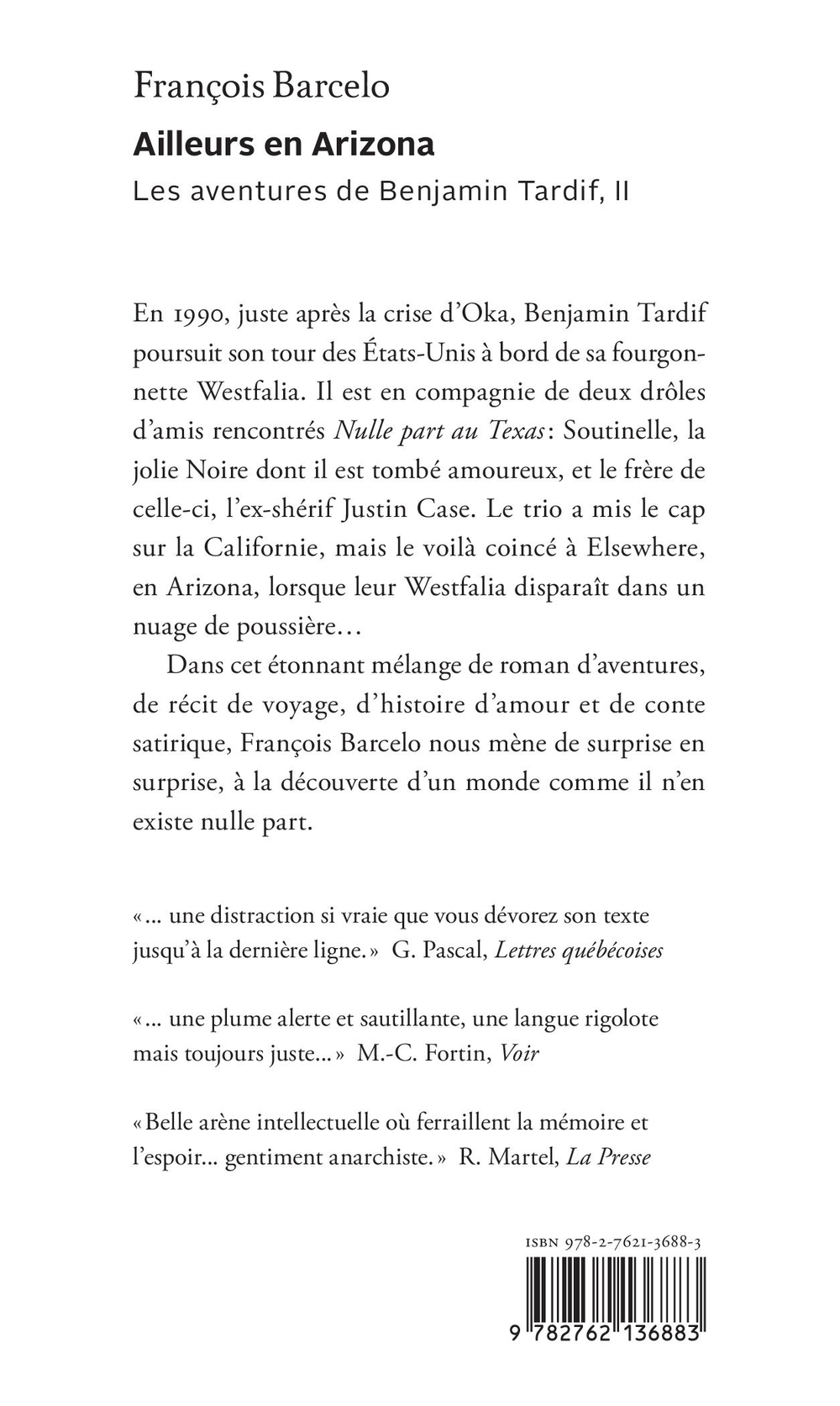En 1990, juste après la crise d’Oka, Benjamin Tardif poursuit son tour des États-Unis à bord de sa fourgonnette Westfalia. Il est en compagnie de deux drôles d’amis rencontrés Nulle part au Texas : Soutinelle, la jolie Noire dont il est tombé amoureux, et le frère de celle-ci, l’ex-shérif Justin Case. Le trio a mis le cap sur la Californie, mais le voilà coincé à Elsewhere, en Arizona, lorsque leur Westfalia disparaît dans un nuage de poussière…Dans cet étonnant mélange de roman d’aventures, de récit de voyage, d’histoire d’amour et de conte satirique, François Barcelo nous mène de surprise en surprise, à la découverte d’un monde comme il n’en existe nulle part. «... une distraction si vraie que vous dévorez son texte jusqu’à la dernière ligne.» G. Pascal, Lettres québécoises«... une plume alerte et sautillante, une langue rigolote mais toujours juste...» M.-C. Fortin, Voir«Belle arène intellectuelle où ferraillent la mémoire et l’espoir... gentiment anarchiste.» R. Martel, La Presse