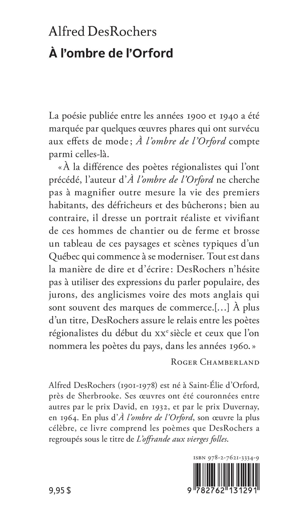 La poésie publiée entre les années 1900 et 1940 a été marquée par quelques œuvres phares qui ont survécu aux effets de mode ; À l’ombre de l’Orford compte parmi celles-là. « À la différence des poètes régionalistes qui l’ont précédé, l’auteur d’ À l’ombre de l’Orford ne cherche pas à magnifier outre mesure la vie des premiers habitants, des défricheurs et des bûcherons ; bien au contraire, il dresse un portrait réaliste et vivifiant de ces hommes de chantier ou de ferme et brosse un tableau de ces paysages et scènes typiques d’un Québec qui commence à se moderniser. Tout est dans la manière de dire et d’écrire : DesRochers n’hésite pas à utiliser des expressions du parler populaire, des jurons, des anglicismes voire des mots anglais qui sont souvent des marques de commerce.[…] À plus d’un titre, DesRochers assure le relais entre les poètes régionalistes du début du xx e siècle et ceux que l’on nommera les poètes du pays, dans les années 1960. »Roger ChamberlandAlfred DesRochers (1901-1978) est né à Saint-Élie d’Orford, près de Sherbrooke. Ses œuvres ont été couronnées entre autres par le prix David, en 1932, et par le prix Duvernay, en 1964. En plus d’ À l’ombre de l’Orford, son œuvre la plus célèbre, ce livre comprend les poèmes que DesRochers a regroupés sous le titre de L’offrande aux vierges folles.