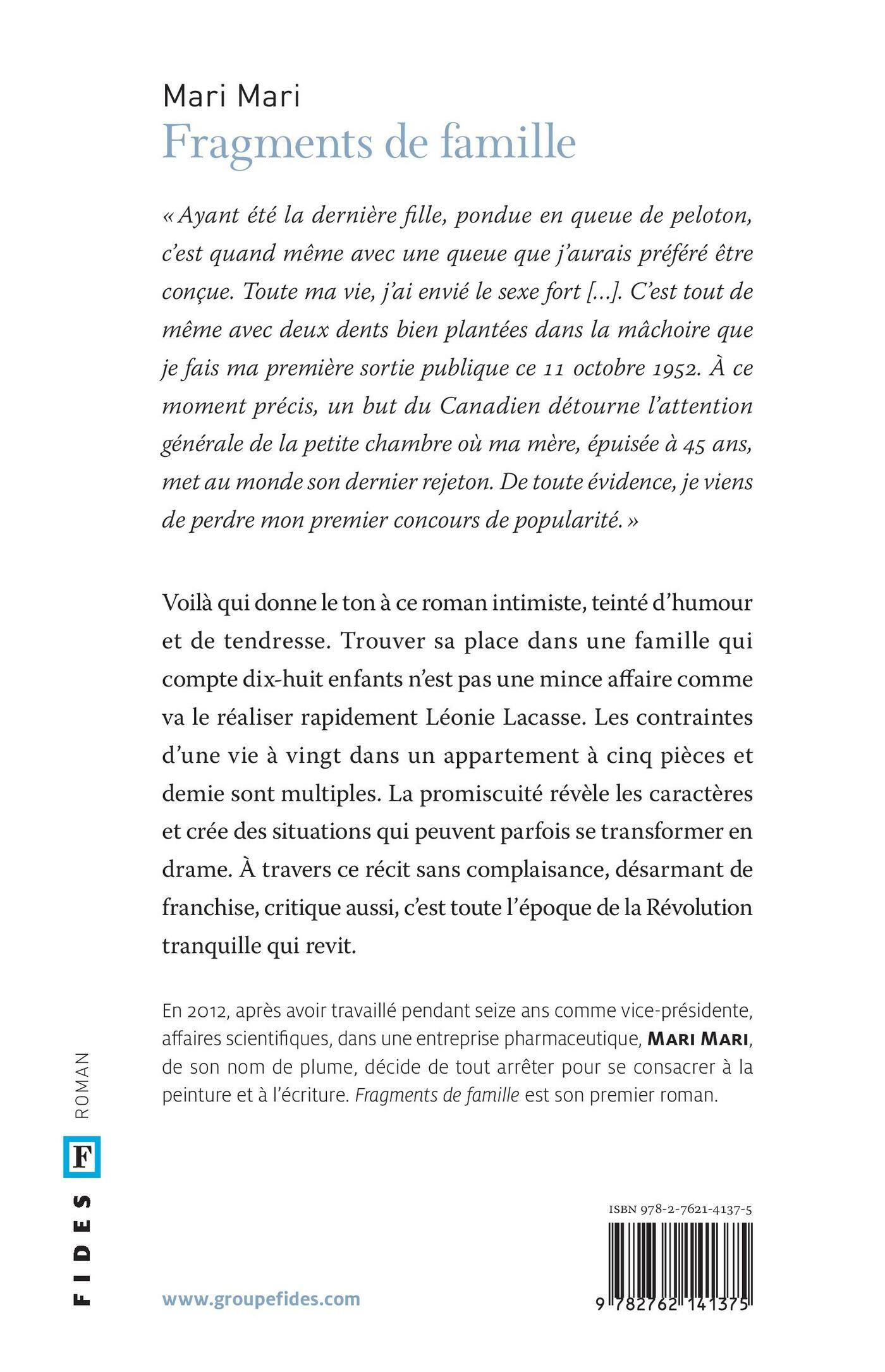 «Ayant été la dernière fille, pondue en queue de peloton, c’est quand même avec une queue que j’aurais préféré être conçue. Toute ma vie, j’ai envié le sexe fort […]. C’est tout de même avec deux dents bien plantées dans la mâchoire que je fais ma première sortie publique ce 11 octobre 1952. À ce moment précis, un but du Canadien détourne l’attention générale de la petite chambre où ma mère, épuisée à 45 ans, met au monde son dernier rejeton. De toute évidence, je viens de perdre mon premier concours de popularité.»Voici qui donne le ton à ce roman intimiste, teinté d’humour et de tendresse où la Révolution tranquille tient lieu de personnage. Trouver sa place dans une famille qui compte dix-huit enfants n’est pas une mince affaire, comme va le réaliser rapidement Léonie Lacasse. Les contraintes d’une vie à vingt dans un appartement à cinq pièces et demie sont multiples. La promiscuité révèle les caractères et crée des situations qui peuvent parfois se transformer en drame. À travers ce récit sans complaisance, désarmant de franchise, critique aussi, Mari Mari nous plonge dans un univers poétique qui, à sa manière, pourrait faire écho aux charmes d’un Léolo de Jean-Claude Lauzon. À lire absolument.