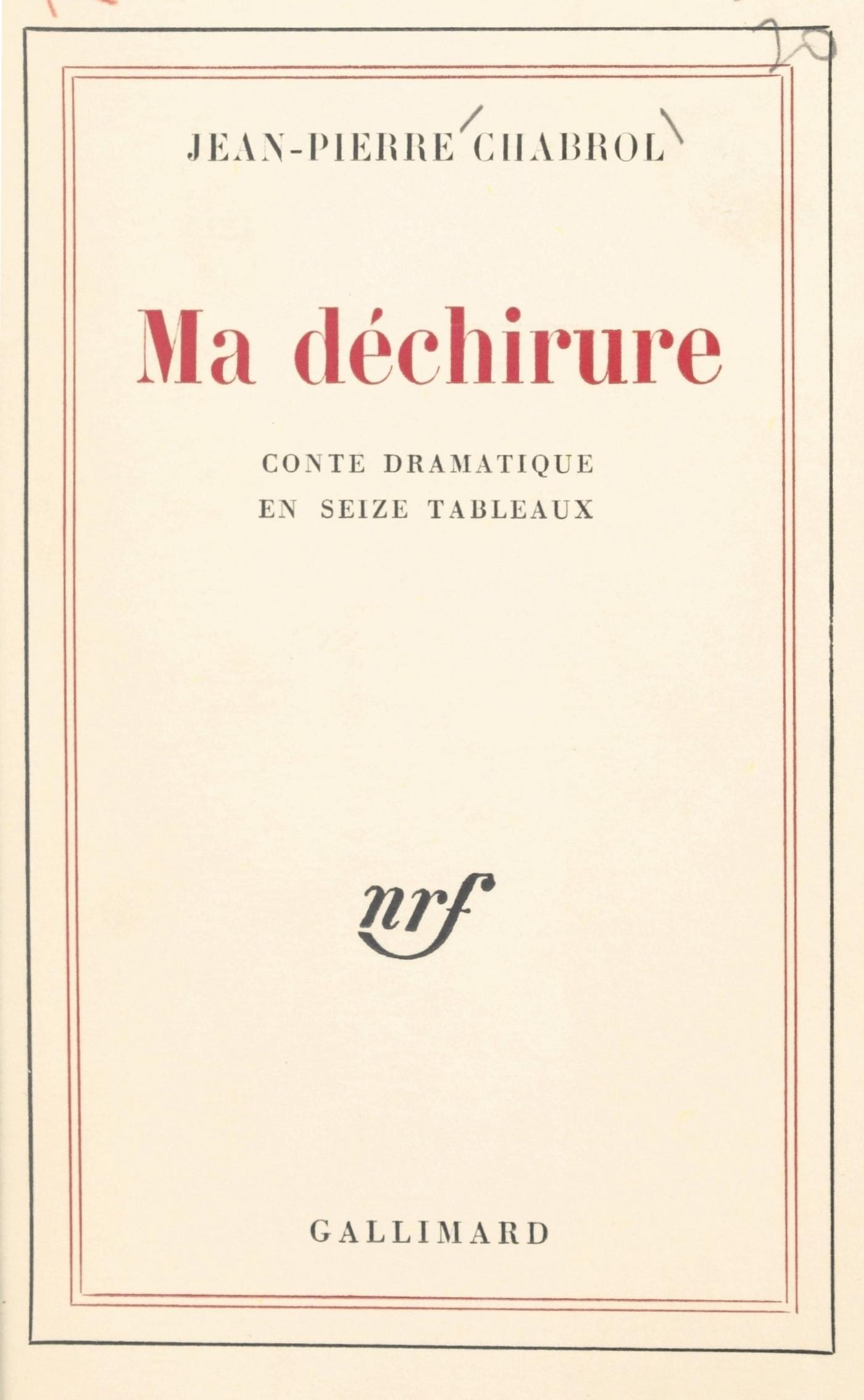 Ma déchirure, qui est une adaptation à la scène du roman de Chabrol, Je t’aimerai sans vergogne, publié en septembre 1967, a été créée le 21 février 1968 au Théâtre de la Commune à Aubervilliers. Au départ un procès : d’un côté les Ruiz, de l’autre les Palomi, un pêcheur et un douanier, un réfugié espagnol et un fonctionnaire corse. Au milieu des cris, le regard silencieux échangé entre Pascal et Nièvès, rejetons de ces deux familles ennemies. L’amour plonge brusquement Nièvès et Pascal dans un univers neuf, et c’est au moment où ils se croient libres et disponibles que leur lien à un milieu social et familial se fait sentir. Nièvès est hantée par les images de sang et de mort dont sa tante la Morèna pare les amours d’Aïcha et Diego Ruiz. Pascal fait des études à Paris et n’a plus avec les siens d’attache réelle. C’est un déraciné et Nièvès, fille d’émigré, fruit conjugal de plusieurs civilisations, arabe et espagnole, l’étonne. Elle représente pour lui la tentation d’un certain absolu entrevue dans le monde intellectuel de ses lectures. Dans le passage d’un mode romanesque à un mode dramatique, le roman utilisait un thème bien théâtral : celui du déguisement. Nièvès, à l’aide d’images « dans le vent » que lui offrent les magazines, la télévision, se compose un personnage vif en couleur : Jenny. Elle brise le jeu de Pascal qui se voulait pour l’été le « Don Juan de la Marine ». Jenny est devenue sa confidente, sa bonne amie, plus que la femelle. Avec Nièvès, il se retrouve dans le costume fripé du jeune premier romantique ; le sentiment du ridicule le gagne. C’est l’éternel jeu des apparences, le personnage que chacun campe pour autrui, si bien que la vérité fuit. Pour la fille des Ruiz, qui de Nièvès ou de Jenny existe ? La « déchirure » de Pascal l’enferme dans une île, son bateau. Le langage suit les différents mouvements de la pièce. La Morèna est tantôt la vieille qui tient la maison, ravaude le linge, fait la cuisine ; tantôt elle est le chœur, la Mère qui commente l’action, en la remodelant elle-même pour lui faire redire l’histoire des ancêtres. Ailleurs, sa pensée puise dans l’événement, elle devine ; les mots affluent et leur accumulation permet d’aller au-delà du sens propre : la Morèna devient la Maquerelle : c’est la scène de la défloraison où prononçant une sorte de litanie, elle retrouve les gestes d’un rituel. Ainsi la pièce remet en question le sujet du roman. Elle tente de faire écouter à la scène les élucubrations et les déchirements intérieurs par ce qui est appelé « une physique de la parole ».