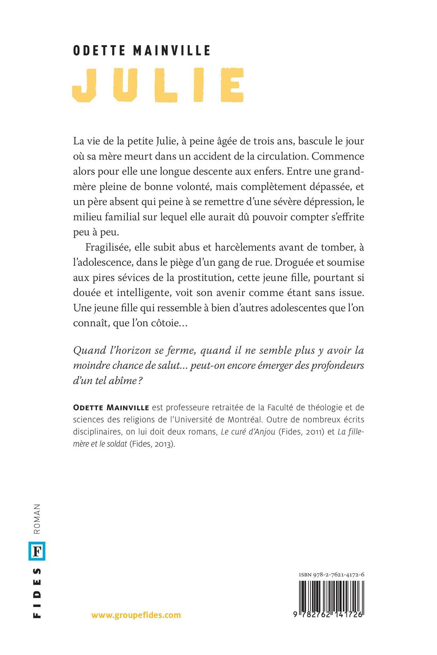 La vie de la petite Julie, à peine âgée de trois ans, bascule le jour où sa mère meurt dans un accident de la circulation. Commence alors pour elle une longue descente aux enfers. Entre une grand-mère pleine de bonne volonté, mais complètement dépassée, etun père absent qui peine à se remettre d’une sévère dépression, le milieu familial sur lequel elle aurait dû pouvoir compter s’effrite peu à peu.Fragilisée, elle subit abus et harcèlements avant de tomber, à l’adolescence, dans le piège d’un gang de rue. Droguée et soumise aux pires sévices de la prostitution, cette jeune fille, pourtant si douée et intelligente, voit son avenir comme étant sans issue.Une jeune fille qui ressemble à bien d’autres adolescentes que l’on connaît, que l’on côtoie…Quand l’horizon se ferme, quand il ne semble plus y avoir la moindre chance de salut… peut-on encore émerger des profondeurs d’un tel abîme?