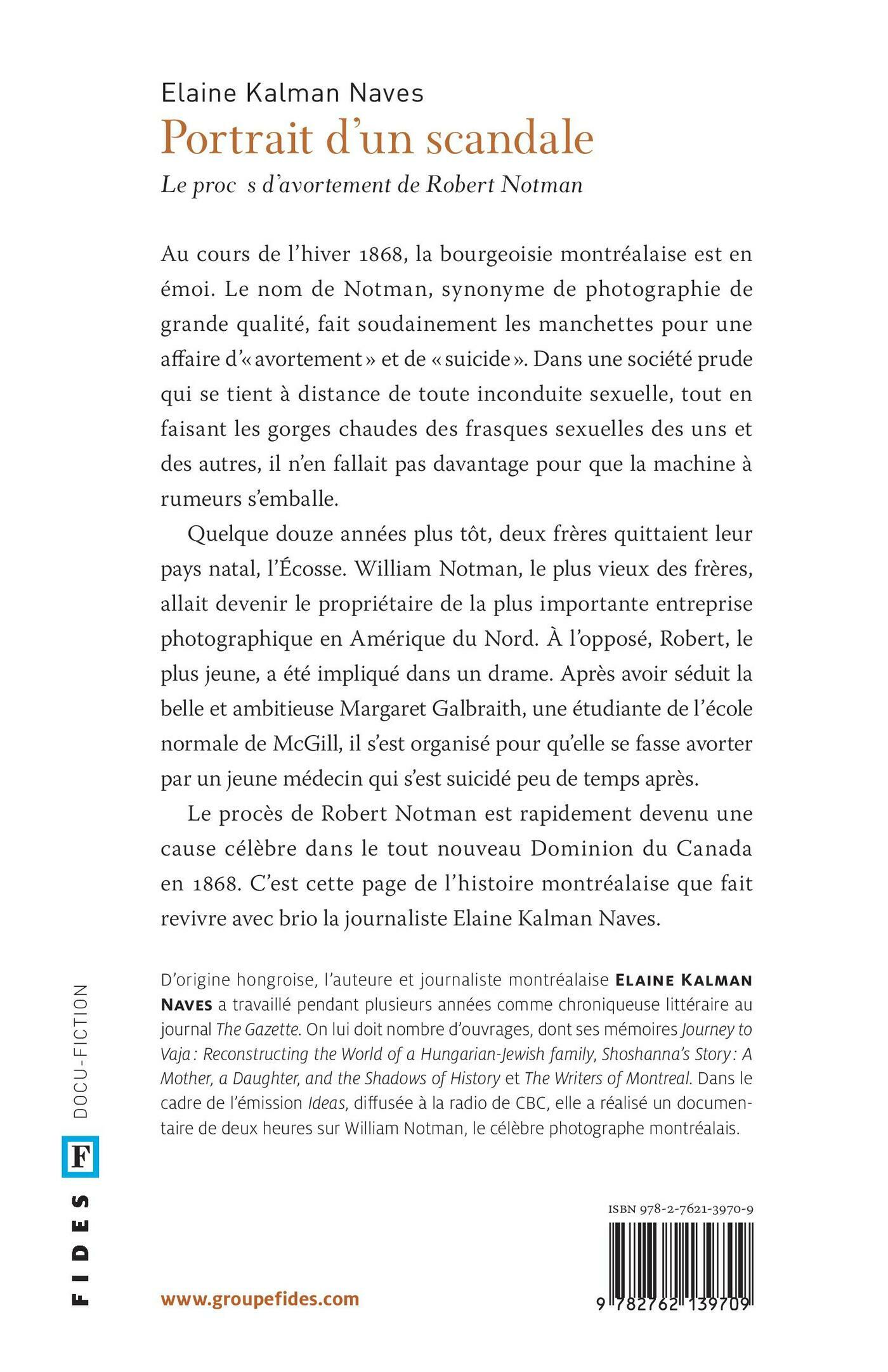 Traduit de l’anglais par Chantal RinguetAu cours de l’hiver 1868, la bourgeoisie montréalaise est en émoi. Le nom de Notman, synonyme de photographie de grande qualité, fait soudainement les manchettes pour une affaire d’«avortement» et de «suicide». Dans une société prude qui se tient à distance de toute inconduite sexuelle, tout en faisant les gorges chaudes des frasques sexuelles des uns et des autres, il n’en fallait pas davantage pour que la machine à rumeurs s’emballe.Quelque douze années plus tôt, deux frères quittaient leur pays natal, l’Écosse. William Notman, le plus vieux des frères, allait devenir le propriétaire de la plus importante entreprise photographique en Amérique du Nord. À l’opposé, Robert, le plus jeune, a été impliqué dans un drame. Après avoir séduit la belle et ambitieuse Margaret Galbraith, une étudiante de l’école normale de McGill, il s’est organisé pour qu’elle se fasse avorter par un jeune médecin qui s’est suicidé peu de temps après.Le procès de Robert Notman est rapidement devenu une cause célèbre dans le tout nouveau Dominion du Canada en 1868. C’est cette page de l’histoire montréalaise que fait revivre avec brio la journaliste Elaine Kalman Naves.