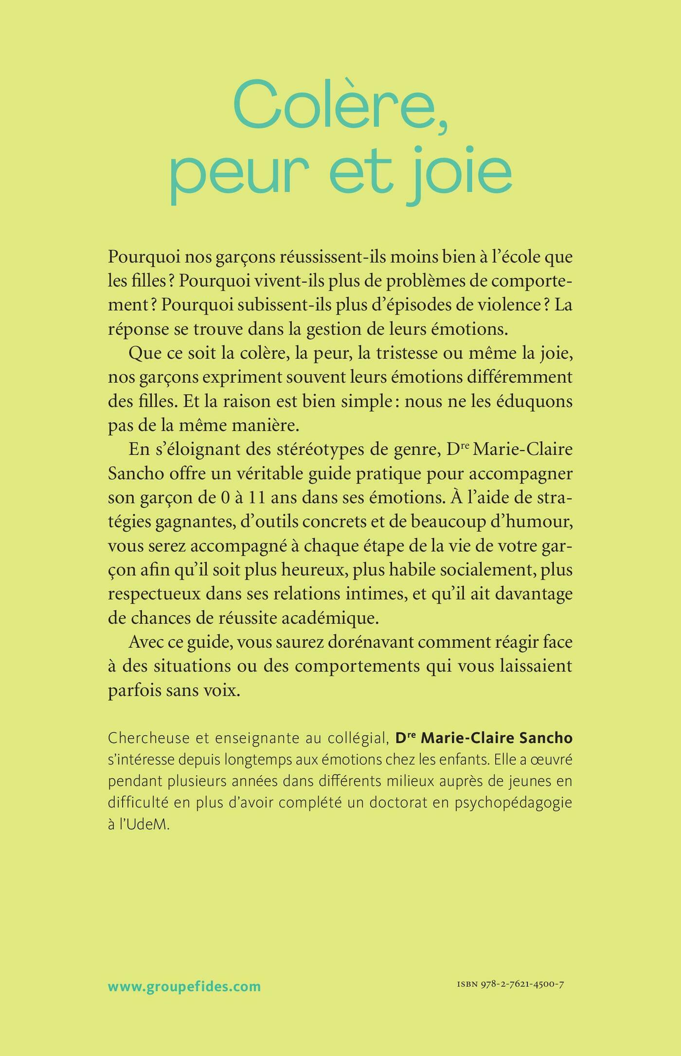 Pourquoi nos garçons réussissent-ils moins bien à l’école que les filles ? Pourquoi vivent-ils plus de problèmes de comportement ? Pourquoi subissent-ils plus d’épisodes de violence ? La réponse se trouve dans la gestion de leurs émotions. Que ce soit la colère, la peur, la tristesse ou même la joie, nos garçons expriment souvent leurs émotions différemment des filles. Et la raison est bien simple : nous ne les éduquons pas de la même manière. En s’éloignant des stéréotypes de genre, Dre Marie-Claire Sancho offre un véritable guide pratique pour accompagner son garçon de 0 à 11 ans dans ses émotions. À l’aide de stratégies gagnantes, d’outils concrets et de beaucoup d’humour, vous serez accompagné à chaque étape de la vie de votre garçon afin qu’il soit plus heureux, plus habile socialement, plus respectueux dans ses relations intimes, et qu’il ait davantage de chances de réussite académique. Avec ce guide, vous saurez dorénavant comment réagir face à des situations ou des comportements qui vous laissaient parfois sans voix.