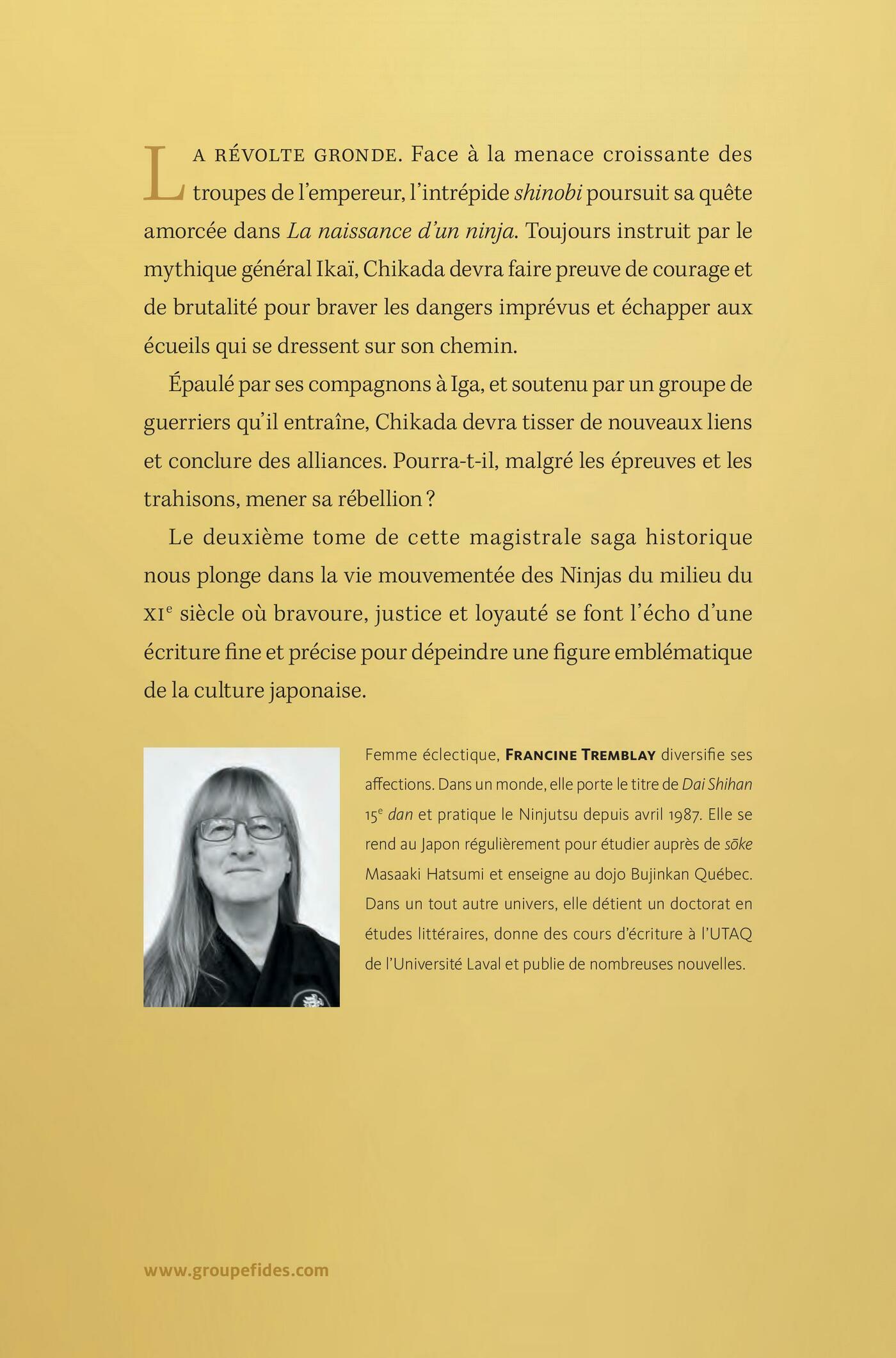 La révolte gronde. Face à la menace croissante des troupes de l’empereur, l’intrépide shinobi poursuit sa quête amorcée dans La naissance d’un ninja. Toujours instruit par le mythique général Ikaï, Chikada devra faire preuve de courage et de brutalité pour braver les dangers imprévus et échapper aux écueils qui se dressent sur son chemin.Épaulé par ses compagnons à Iga, et soutenu par un groupe de guerriers qu’il entraîne, Chikada devra tisser de nouveaux liens et conclure des alliances. Pourra-t-il, malgré les épreuves et les trahisons, mener sa rébellion?Le deuxième tome de cette magistrale saga historique nous plonge dans la vie mouvementée des Ninjas du milieu du xi e siècle où bravoure, justice et loyauté se font l’écho d’une écriture fine et précise pour dépeindre une figure emblématique de la culture japonaise.