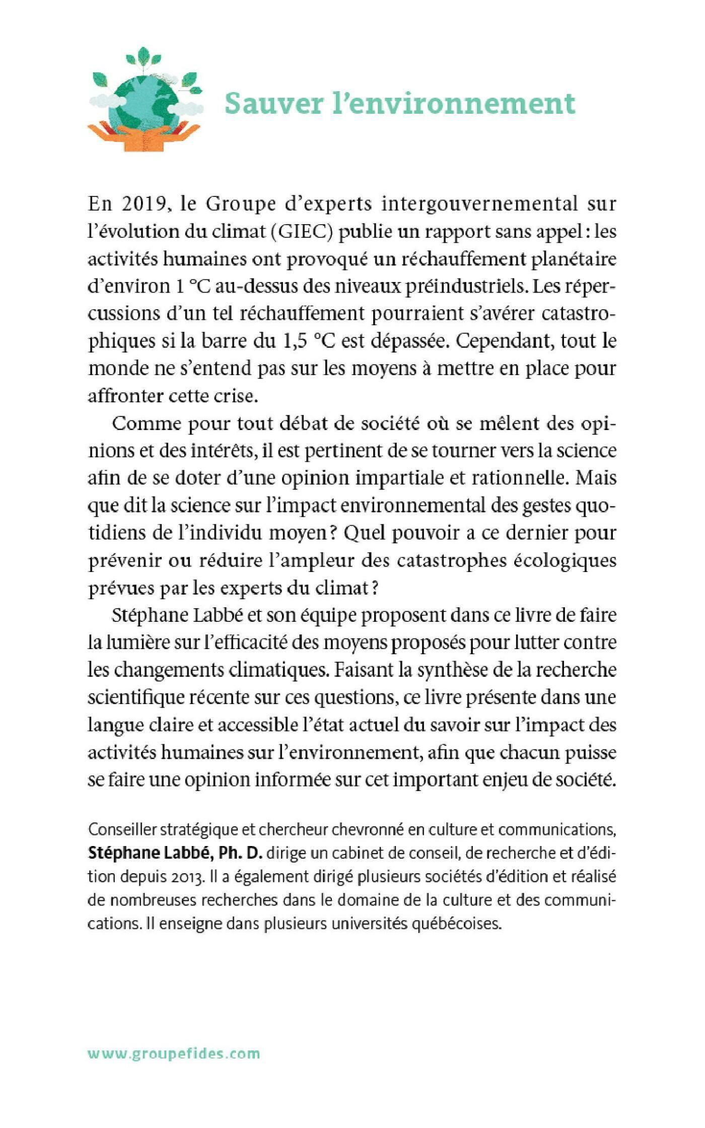 En 2019, le Groupe d’experts intergouvernemental sur l’évolution du climat (GIEC) publie un rapport sans appel : les activités humaines ont provoqué un réchauffement planétaire d’environ 1 °C au-dessus des niveaux préindustriels. Les répercussions d’un tel réchauffement pourraient s’avérer catastrophiques si la barre du 1,5 °C est dépassée. Cependant, tout le monde ne s’entend pas sur les moyens à mettre en place pour affronter cette crise.Comme pour tout débat de société où se mêlent des opinions et des intérêts, il est pertinent de se tourner vers la science afin de se doter d’une opinion impartiale et rationnelle. Mais que dit la science sur l’impact environnemental des gestes quotidiens de l’individu moyen? Quel pouvoir a ce dernier pour prévenir ou réduire l’ampleur des catastrophes écologiques prévues par les experts du climat?Stéphane Labbé et son équipe proposent dans ce livre de faire la lumière sur l’efficacité des moyens proposés pour lutter contre les changements climatiques. Faisant la synthèse de la recherche scientifique récente sur ces questions, ce livre présente dans une langue claire et accessible l’état actuel du savoir sur l’impact des activités humaines sur l’environnement, afin que chacun puisse se faire une opinion informée sur cet important enjeu de société.