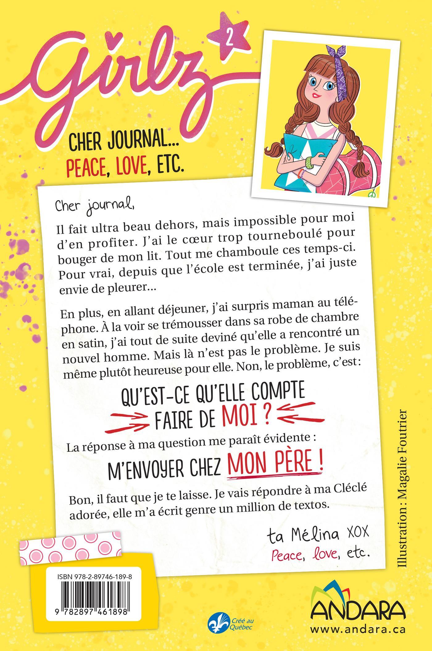 Cher journal,Il fait ultra beau dehors, mais impossible pour moi d’en profiter. J’ai le cœur trop tourneboulé pour bouger de mon lit. Tout me chamboule ces temps-ci. Pour vrai, depuis que l’école est terminée, j’ai juste envie de pleurer...En plus, en allant déjeuner, j’ai surpris maman au téléphone. À la voir se trémousser dans sa robe de chambre en satin, j’ai tout de suite deviné qu’elle a rencontré un nouvel homme. Mais là n’est pas le problème. Je suis même plutôt heureuse pour elle. Non, le problème, c’est :QU’EST-CE QU’ELLE COMPTEFAIRE DE MOI ?La réponse à ma question me paraît évidente :M’ENVOYER CHEZ MON PÈRE !Bon, il faut que je te laisse. Je vais répondre à ma Cléclé adorée, elle m’a écrit genre un million de textos.ta Mélina XOXPeace, love, etc