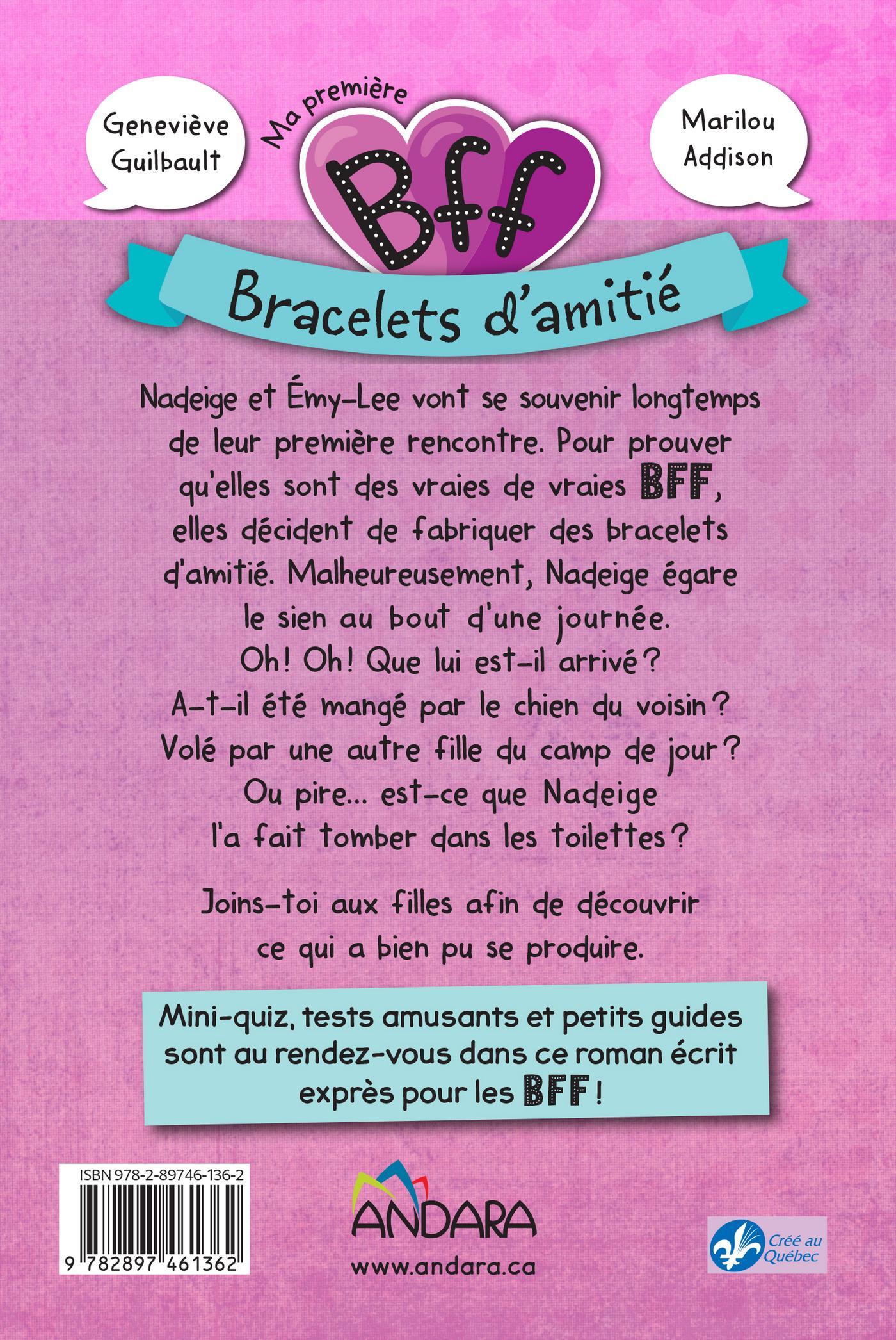 Nadeige et Émy-Lee vont se souvenir longtemps de leur première rencontre. Pour prouver qu’elles sont des vraies de vraies BFF, elles décident de fabriquer des bracelets d’amitié. Malheureusement, Nadeige égare le sien au bout d’une journée.Oh ! Oh ! Que lui est-il arrivé ?A-t-il été mangé par le chien du voisin ?Volé par une autre fille du camp de jour ?Ou pire… est-ce que Nadeigel’a fait tomber dans les toilettes ?Joins-toi aux filles afin de découvrir ce qui a bien pu se produire.Mini-quiz, tests amusants et petits guides sont au rendez-vous dans ce roman écrit exprès pour les BFF !
