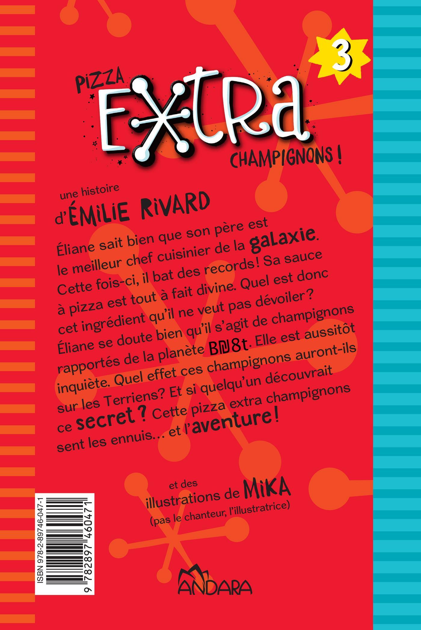 Éliane sait bien que son père est le meilleur chef cuisinier de la galaxie. Cette fois-ci, il bat des records! Sa sauce à pizza est tout à fait divine. Quel est donc cet ingrédient qu’il ne veut pas dévoiler? Se doutant qu’il s’agit de champignons rapportés de la planète B₪8t, Éliane est aussitôt inquiète. Quel effet ces champignons auront-ils sur les Terriens? Et si quelqu’un découvrait ce secret? Cette pizza extra champignons sent les ennuis… et l’aventure!