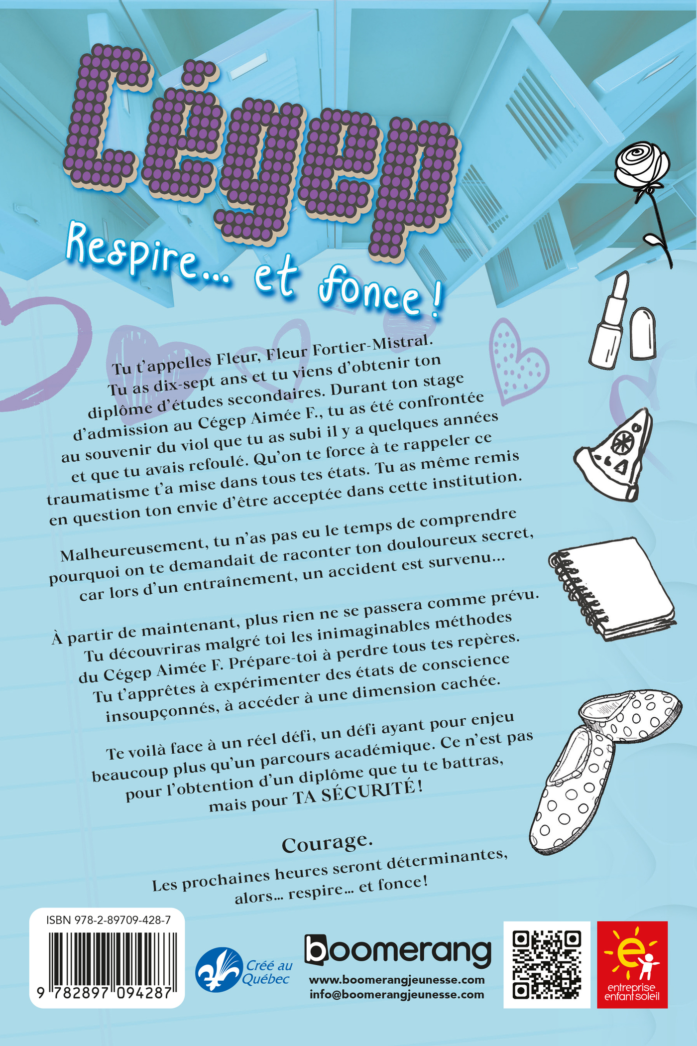Tu t’appelles Fleur, Fleur Fortier-Mistral. Tu as dix-sept ans et tu viens d’obtenir ton diplôme d’études secondaires. Durant ton stage d’admission au Cégep Aimée F., tu as été confrontée au souvenir du viol que tu as subi il y a quelques années et que tu avais refoulé. Qu’on te force à te rappeler ce traumatisme t’a mise dans tous tes états. Tu as même remis en question ton envie d’être acceptée dans cette institution.Malheureusement, tu n’as pas eu le temps de comprendre pourquoi on te demandait de raconter ton douloureux secret, car lors d’un entraînement, un accident est survenu…À partir de maintenant, plus rien ne se passera comme prévu. Tu découvriras malgré toi les inimaginables méthodes du Cégep Aimée F.Prépare-toi à perdre tous tes repères. Tu t’apprêtes à expérimenter des états de conscience insoupçonnés, à accéder à une dimension cachée.Te voilà face à un réel défi, un défi ayant pour enjeu beaucoup plus qu’un parcours académique. Ce n’est pas pour l’obtention d’une diplôme que tu te battras, mais pour TA SÉCURITÉ !Courage. Les prochaines heures seront déterminantes, alors… RESPIRE… ET FONCE!