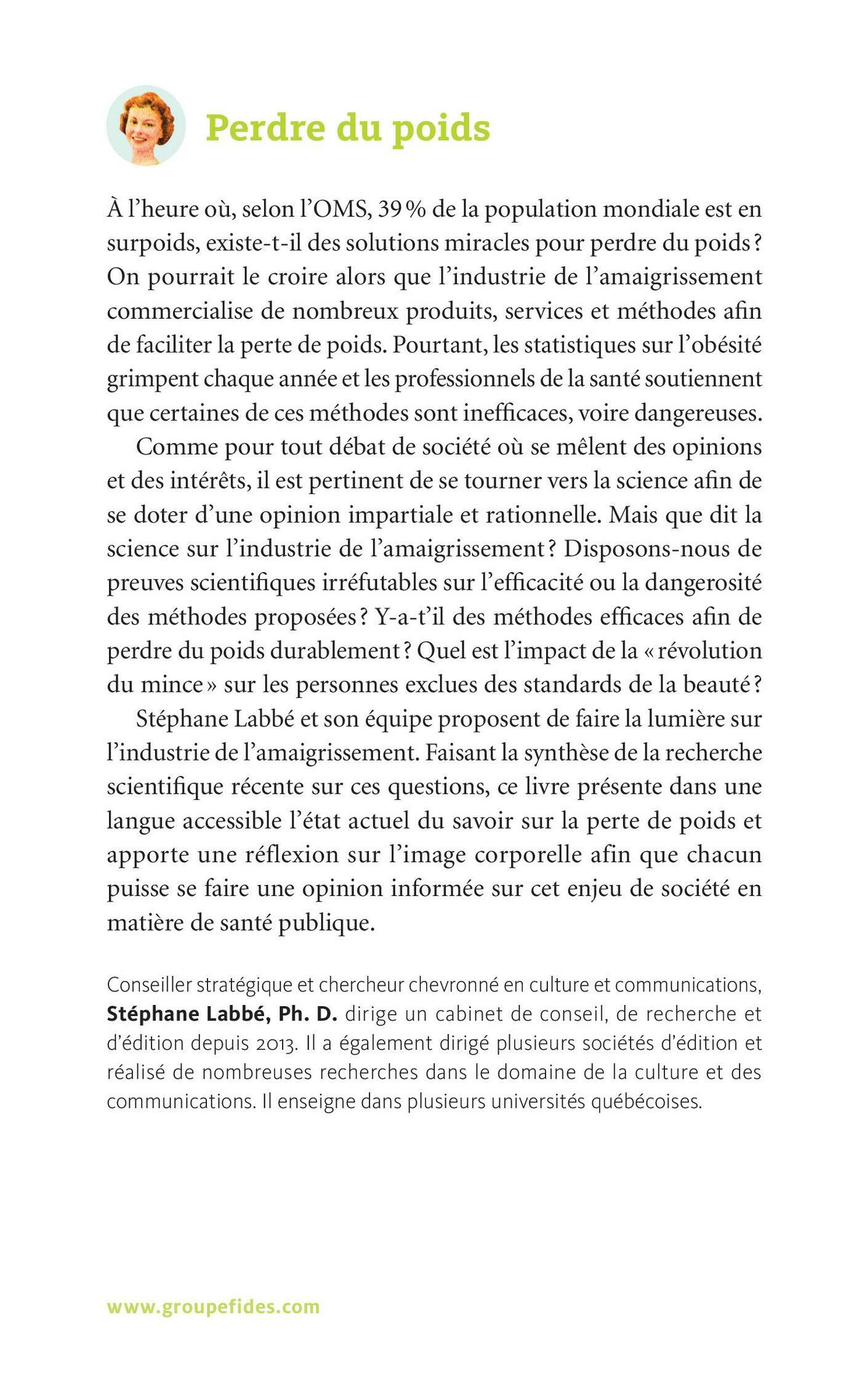 À l’heure où, selon l’OMS, 39% de la population mondiale est en surpoids, existe-t-il des solutions miracles pour perdre du poids? On pourrait le croire alors que l’industrie de l’amaigrissement commercialise de nombreux produits, services et méthodes afin de faciliter la perte de poids. Pourtant, les statistiques sur l’obésité grimpent chaque année et les professionnels de la santé soutiennent que certaines de ces méthodes sont inefficaces, voire dangereuses.Comme pour tout débat de société où se mêlent des opinions et des intérêts, il est pertinent de se tourner vers la science afin de se doter d’une opinion impartiale et rationnelle. Mais que dit la science sur l’industrie de l’amaigrissement? Disposons-nous de preuves scientifiques irréfutables sur l’efficacité ou la dangerosité des méthodes proposées? Y-a-t’il des méthodes efficaces afin de perdre du poids durablement? Quel est l’impact de la «révolution du mince» sur les personnes exclues des standards de la beauté?Stéphane Labbé et son équipe proposent de faire la lumière sur l’industrie de l’amaigrissement. Faisant la synthèse de la recherche scientifique récente sur ces questions, ce livre présente dans une langue accessible l’état actuel du savoir sur la perte de poids et apporte une réflexion sur l’image corporelle afin que chacun puisse se faire une opinion informée sur cet enjeu de société en matière de santé publique.