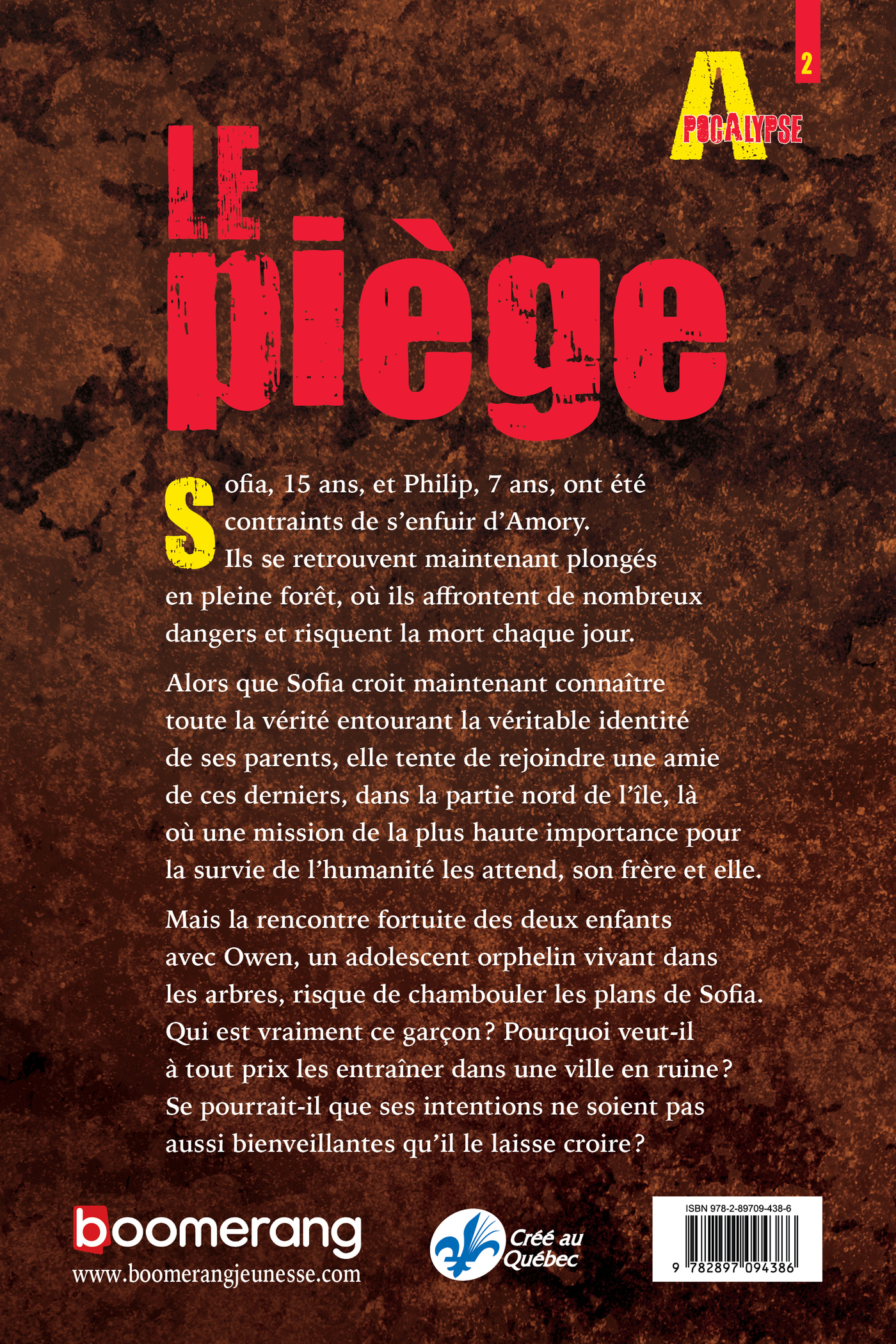 Sofia, 15 ans, et Philip, 7 ans, ont été contraints de s’enfuir d’Amory. Ils se retrouvent maintenant plongés en pleine forêt, où ils affrontent de nombreux dangers et risquent la mort chaque jour. Alors que Sofia croit maintenant connaître toute la vérité entourant la véritable identité de ses parents, elle tente de rejoindre une amie de ces derniers, dans la partie nord de l’île, là où une mission de la plus haute importance pour la survie de l’humanité les attend, son frère et elle. Mais la rencontre fortuite des deux enfants avec Owen, un adolescent orphelin vivant dans les arbres, risque de chambouler les plans de Sofia. Qui est vraiment ce garçon ? Pourquoi veut-il à tout prix les entraîner dans une ville en ruine ? Se pourrait-il que ses intentions ne soient pas aussi bienveillantes qu’il le laisse croire ?