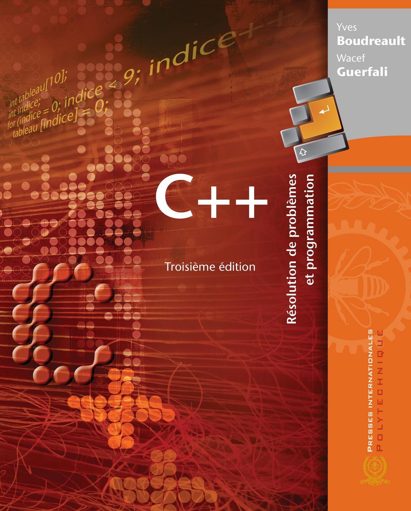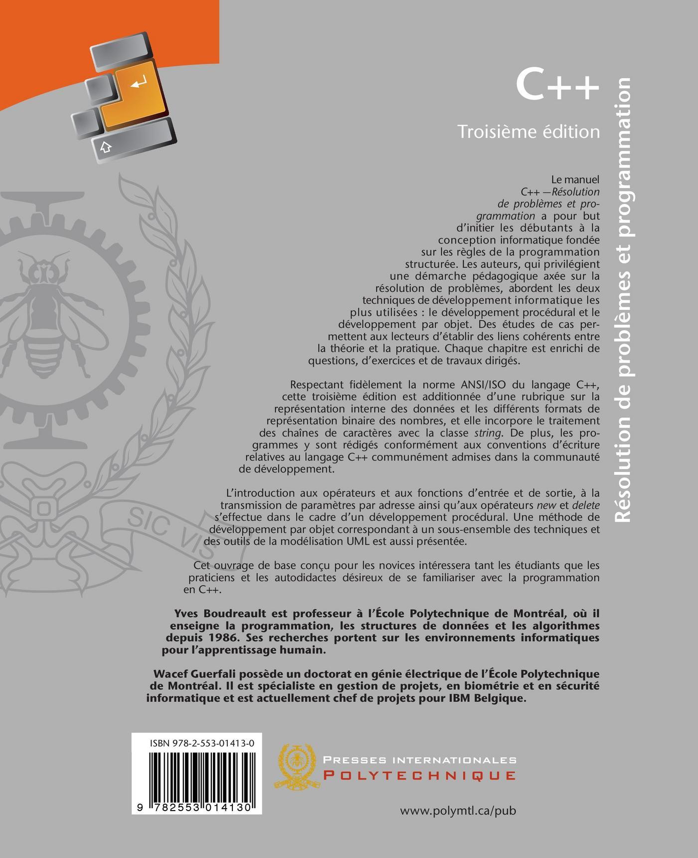 Le manuel "C++ Résolution de problèmes et programmation" a pour but d'initier les débutants à la conception informatique fondée sur les règles de la programmation structurée. Les auteurs, qui privilégient une démarche pédagogique axée sur la résolution de problèmes, abordent les deux techniques de développement informatique les plus utilisées : le développement procédural et le développement par objet. Des études de cas permettent aux lecteurs d'établir des liens cohérents entre la théorie et la pratique. Chaque chapitre est enrichi de questions, d'exercices et de travaux dirigés. Respectant fidèlement la norme ANSI/ISO du langage C++, cette troisième édition est additionnée d'une rubrique sur la représentation interne des données et les différents formats de représentation binaire des nombres, et elle incorpore le traitement des chaînes de caractères avec la classe string. De plus, les programmes y sont rédigés conformément aux conventions d'écriture relatives au langage C++ communément admises dans la communauté de développement. L'introduction aux opérateurs et aux fonctions d'entrée et de sortie, à la transmission de paramètres par adresse ainsi qu'aux opérateurs new et delete s'effectue dans le cadre d'un développement procédural. Une méthode de développement par objet correspondant à un sous-ensemble des techniques et des outils de la modélisation UML est aussi présentée. Cet ouvrage de base conçu pour les novices intéressera tant les étudiants que les praticiens et les autodidactes désireux de se familiariser avec la programmation en C++.
