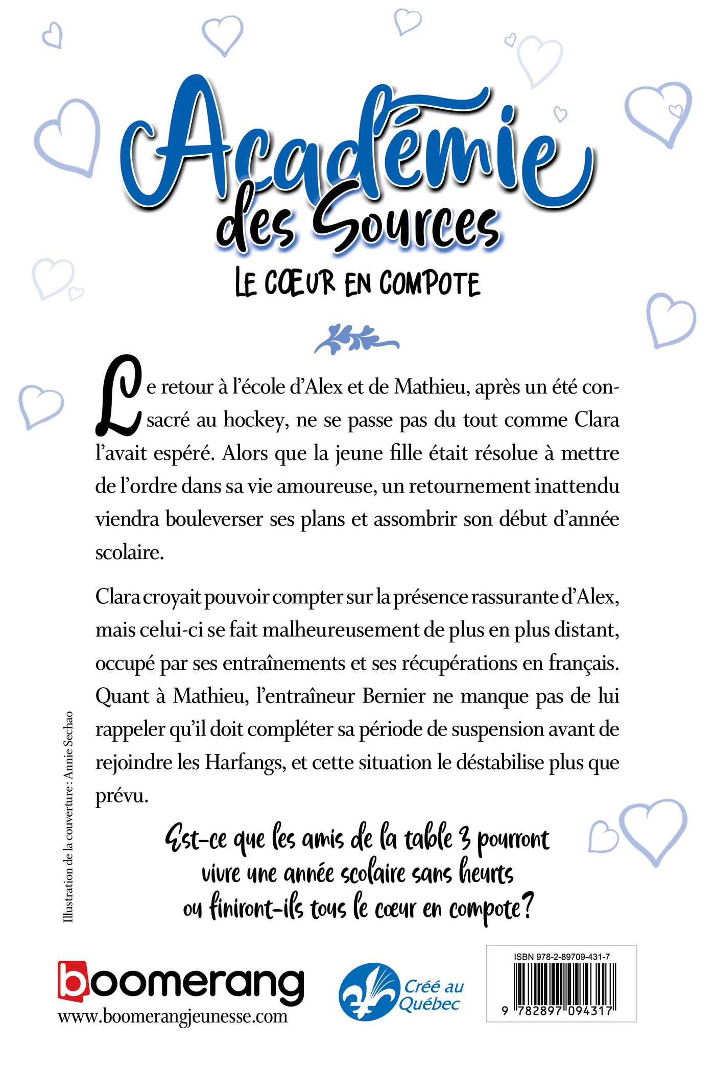 Le retour à l’école d’Alex et de Mathieu, après un été consacré au hockey, ne se passe pas du tout comme Clara l’avait espéré. Alors que la jeune fille était résolue à mettre de l’ordre dans sa vie amoureuse, un retournement inattendu viendra bouleverser ses plans et assombrir son début d’année scolaire. Clara croyait pouvoir compter sur la présence rassurante d’Alex, mais celui-ci se fait malheureusement de plus en plus distant,occupé par ses entraînements et ses récupérations en français. Quant à Mathieu, l’entraîneur Bernier ne manque pas de lui rappeler qu’il doit compléter sa période de suspension avant de rejoindre les Harfangs, et cette situation le déstabilise plus que prévu.Est-ce que les amis de la table 3 pourront vivre une année scolaire sans heurts ou finiront-ils tous le cœur en compote ?