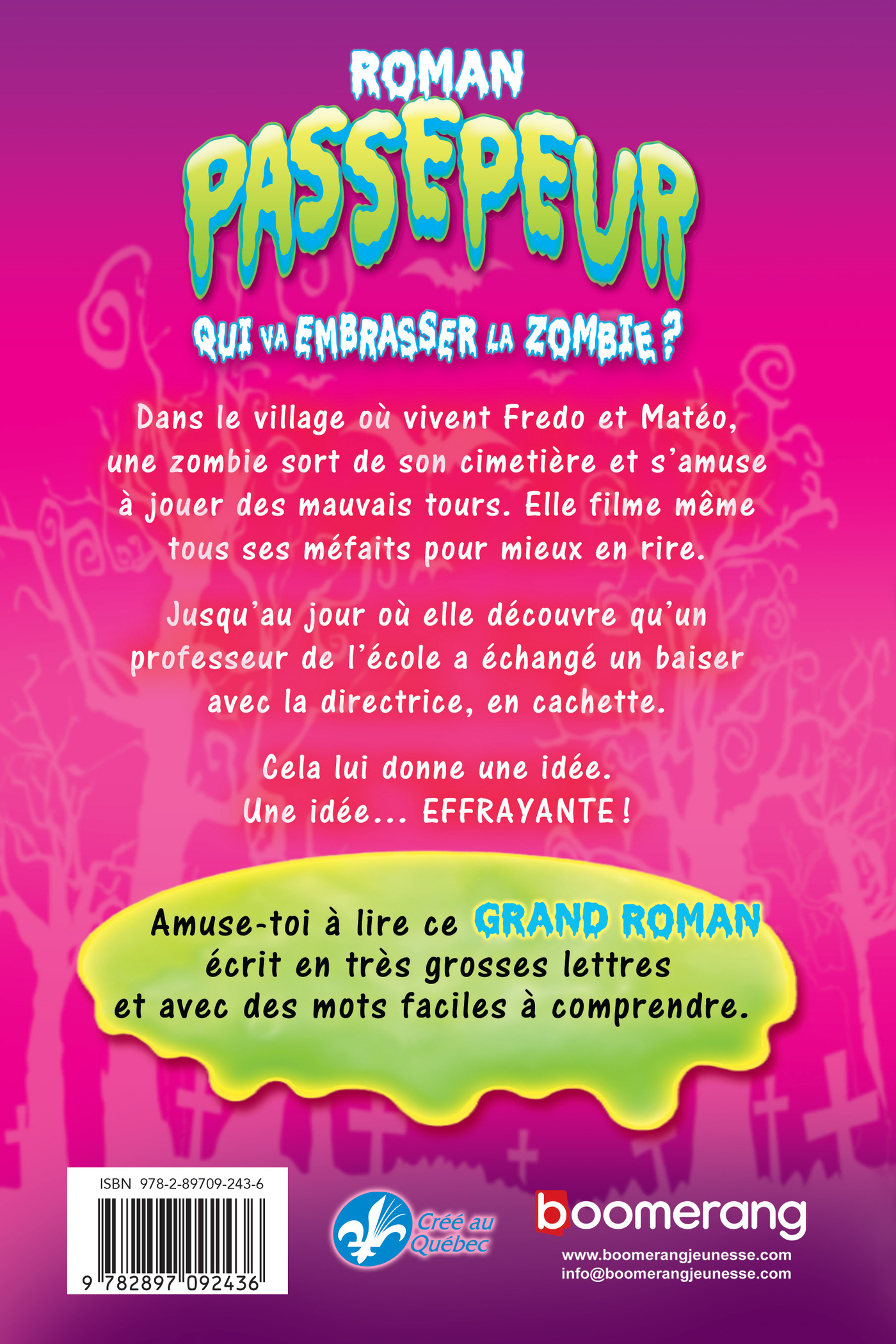 Dans le village où vivent Fredo et Matéo, une zombie sort de son cimetière et s'amuse à jouer des mauvais tours. Elle filme même tous ses méfaits pour mieux en rire.Jusqu'au jour où elle découvre qu'un professeur de l'école a échangé un baiser avec la directrice, en cachette.Cela lui donne une idée.Une idée... EFFRAYANTE!Amuse-toi à lire ce GRAND ROMAN écrit en très grosses lettres et avec des mots faciles à comprendre.