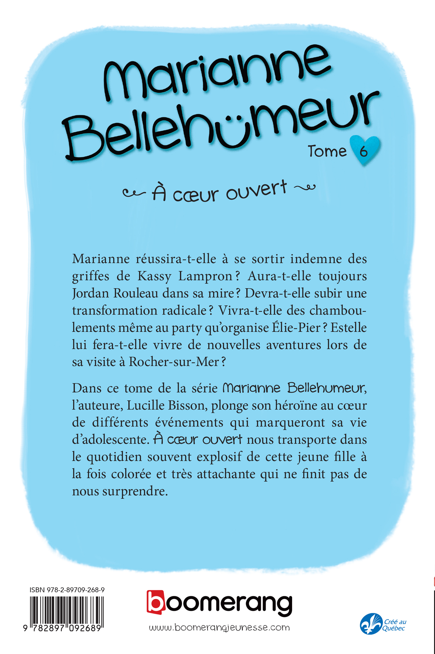 Marianne réussira-t-elle à se sortir indemne des griffes de Kassy Lampron? Aura-t-elle toujours Jordan Rouleau dans sa mire? Devra-t-elle subir une transformation radicale? Vivra-t-elle des chamboulements même au party qu'organise Élie-Pier? Estelle lui fera-t-elle vivre de nouvelles aventures lors de sa visite à Rocher-sur-Mer?Dans ce tome de la série Marianne Bellehumeur, l'auteure, Lucille Bisson, plonge son héroïne au cœur de différents événements qui marqueront sa vie d'adolescente. À cœur ouvert nous transporte dans le quotidien souvent explosif de cette jeune fille à la fois colorée et très attachante qui ne finit pas de nous surprendre.