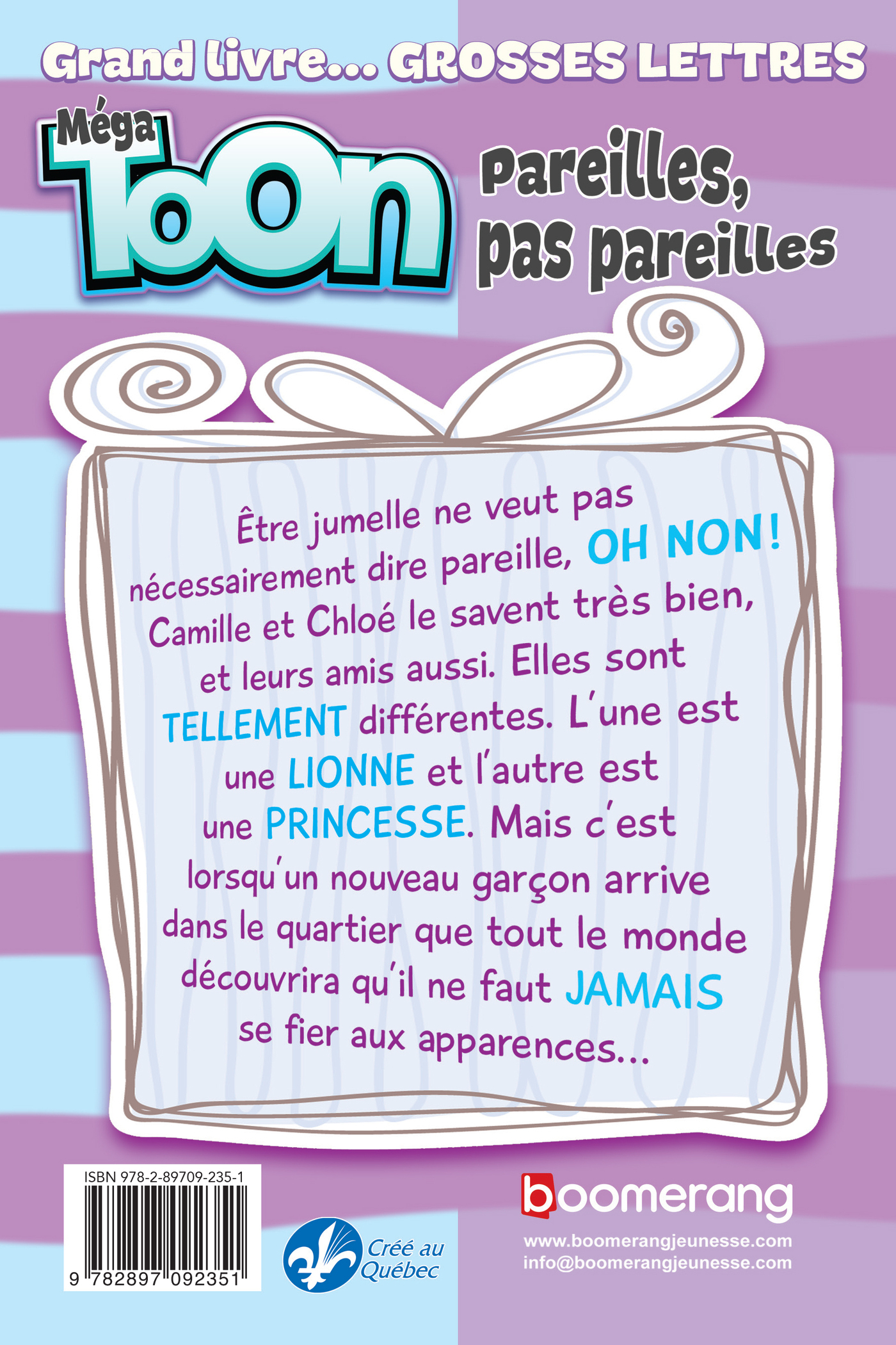 Être jumelle ne veut pas nécessairement dire pareille. Oh non! Camille et Chloé le savent très bien, et leurs amis aussi. Elles sont tellement différentes. L’une est une LIONNE, et l’autre est une PRINCESSE.Mais c’est lorsqu’un nouveau garçon arrive dans le quartier que tout le monde découvre qu’il ne faut JAMAIS se fier aux apparences...