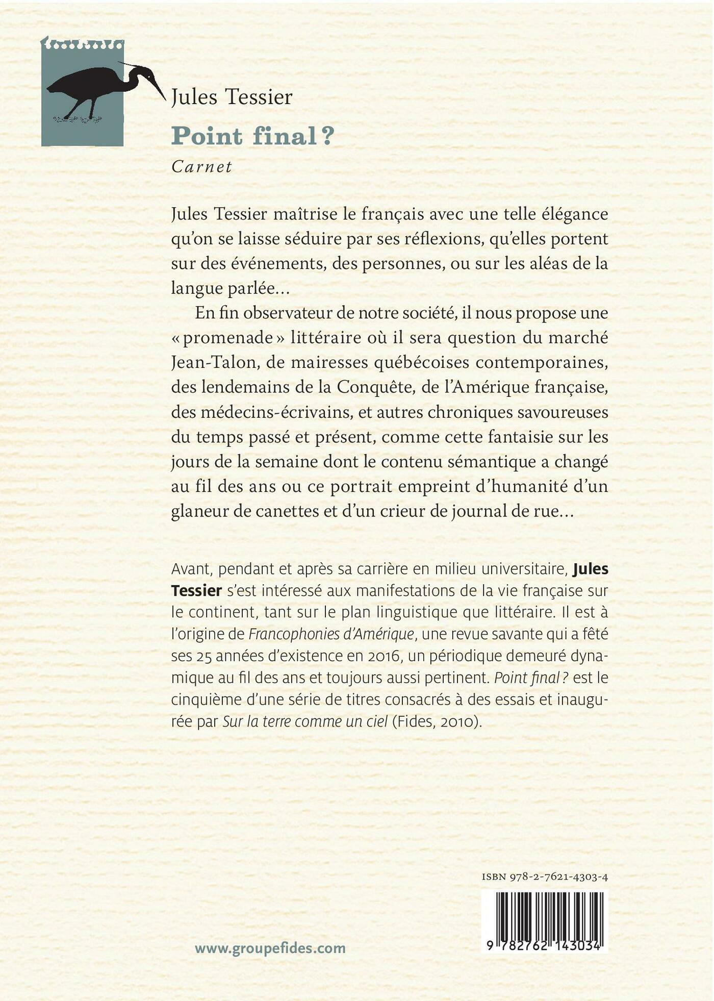 Jules Tessier maîtrise le français avec une telle élégance qu’on se laisse séduire par ses réflexions, qu’elles portent sur des événements, des personnes, ou sur les aléas de la langue parlée…En fin observateur de notre société, il nous propose une «promenade» littéraire où il sera question du marché Jean-Talon, de mairesses québécoises contemporaines, des lendemains de la Conquête, de l’Amérique française, des médecins-écrivains, et autres chroniques savoureuses du temps passé et présent, comme cette fantaisie sur les jours de la semaine dont le contenu sémantique a changé au fil des ans ou ce portrait empreint d’humanité d’un glaneur de canettes et d’un crieur de journalde rue…
