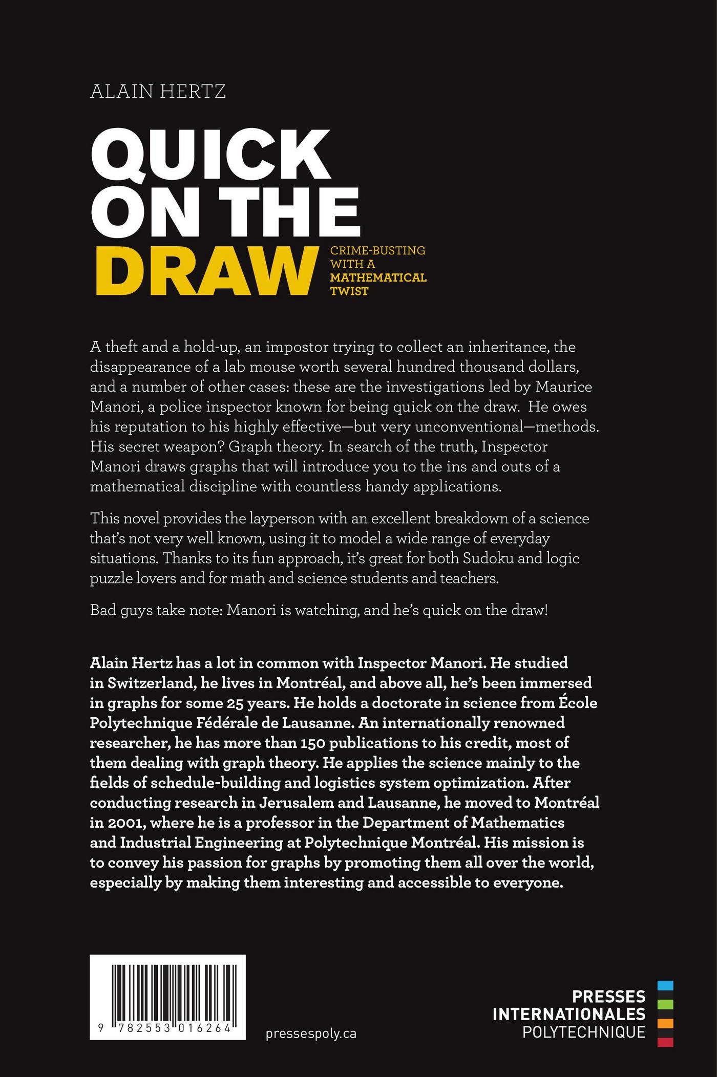 A theft and a hold-up, an impostor trying to collect an inheritance, the disappearance of a lab mouse worth several hundred thousand dollars, and a number of other cases : these are the investigations led by Maurice Manori, a police inspector known for being quick on the draw. He owes his reputation to his highly effective (but very unconventional ) methods. His secret weapon ? Graph theory. In search of the truth, Inspector Manori draws graphs that will introduce you to the ins and outs of a mathematical discipline with countless handy applications. This novel provides the layperson with an excellent breakdown of a science that's not very well known, using it to model a wide range of everyday situations. Thanks to its fun approach, it's great for both Sudoku and logic puzzle lovers and for math and science students and teachers. Bad guys take note : Manori is watching, and he's quick on the draw !