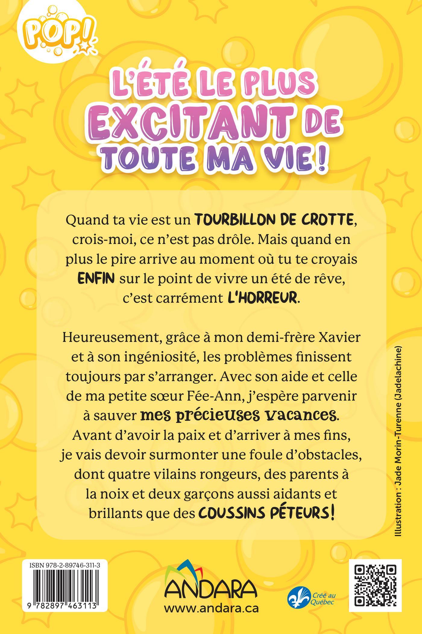 Quand ta vie est un tourbillon de crotte, crois-moi, ce n’est pas drôle. Mais quand en plus le pire arrive au moment où tu te croyais ENFIN sur le point de vivre un été de rêve, c’est carrément L’HORREUR.Heureusement, grâce à mon demi-frère Xavier et à son ingéniosité les problèmes finissent toujours par s’arranger. Avec son aide et celle de ma petite sœur Fée-Ann, j’espère parvenir à sauver mes précieuses vacances.Avant d’avoir la paix et d’arriver à mes fins, je vais devoir surmonter une foule d’obstacles, dont quatre vilains rongeurs, des parents à la noix et deux garçons aussi aidants et brillants que des COUSSINS PÉTEURS !