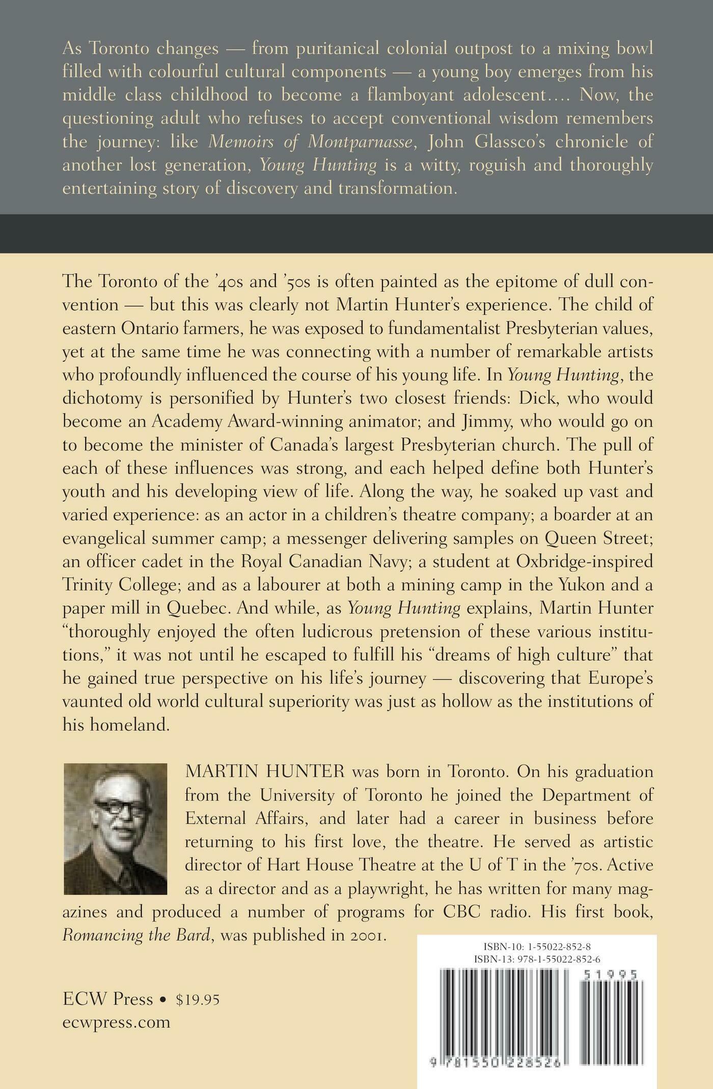 Taking inspiration from John Glassco's Memoirs of Montparnasse, Young Hunting is both a story of discovery and transformation. While Toronto changes around him, from a puritanical British colonial outpost to a mixing bowl filled with colourful cultural components, a young boy emerges from his middle class childhood to become a flamboyant adolescent a questioning adult who refuses to accept conventional wisdom.The Toronto of the '40s and '50s is often painted as the epitome of dull convention - but this was clearly not Martin Hunter's experience. The child of eastern Ontario farmers, he was exposed to fundamentalist Presbyterian values; yet at the same time he was connecting with a number of remarkable artists who profoundly influenced the course of his young life. In Young Hunting, the dichotomy is personified by Hunter's two closest friends: Dick, who would become an Academy Award-winning animator; and Jimmy, who would go on to become the minister of Canada's largest Presbyterian church. The pull of each of these influences was strong, and each helped define both Hunter's youth and developing view of life. Along the way, he soaked up vast and varied experience: as an actor in a children's theatre company; a boarder at an evangelical summer camp; a messenger delivering samples on Queen Street; an officer cadet in the Royal Canadian Navy; a student at Oxbridge-inspired Trinity College; and as a labourer at both a mining camp in the Yukon and a paper mill in Quebec. And while, as Young Hunting explains, Martin Hunter "thoroughly enjoyed the often ludicrous pretension of these various institutions," it was not until he escaped to fulfill his "dreams of high culture" that he gained true perspective on his life's journey - discovering that Europe's vaunted old world cultural superiority was just as hollow as the institutions of his homeland.