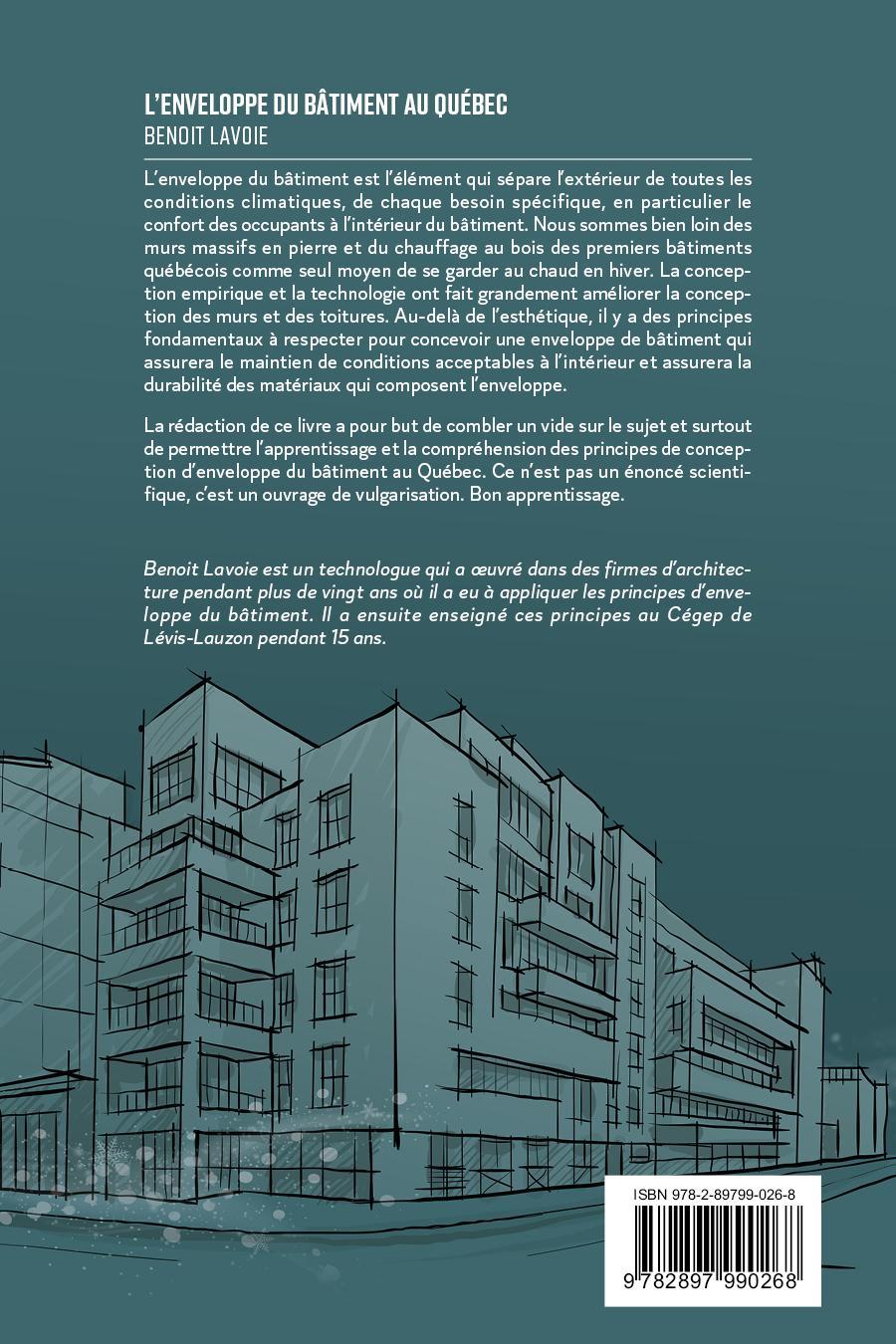 L’enveloppe du bâtiment est l’élément qui sépare l’extérieur de toutes les conditions climatiques, de chaque besoin spécifique, en particulier le confort des occupants à l’intérieur du bâtiment. Nous sommes bien loin des murs massifs en pierre et du chauffage au bois des premiers bâtiments québécois comme seul moyen de se garder au chaud en hiver. La conception empirique et la technologie ont fait grandement améliorer la conception des murs et des toitures. Au-delà de l’esthétique, il y a des principes fondamentaux à respecter pour concevoir une enveloppe de bâtiment qui assurera le maintien de conditions acceptables à l’intérieur et assurera la durabilité des matériaux qui composent l’enveloppe.La rédaction de ce livre a pour but de combler un vide sur le sujet et surtout de permettre l’apprentissage et la compréhension des principes de conception d’enveloppe du bâtiment au Québec. Ce n’est pas un énoncé scientifique, c’est un ouvrage de vulgarisation. Bon apprentissage.