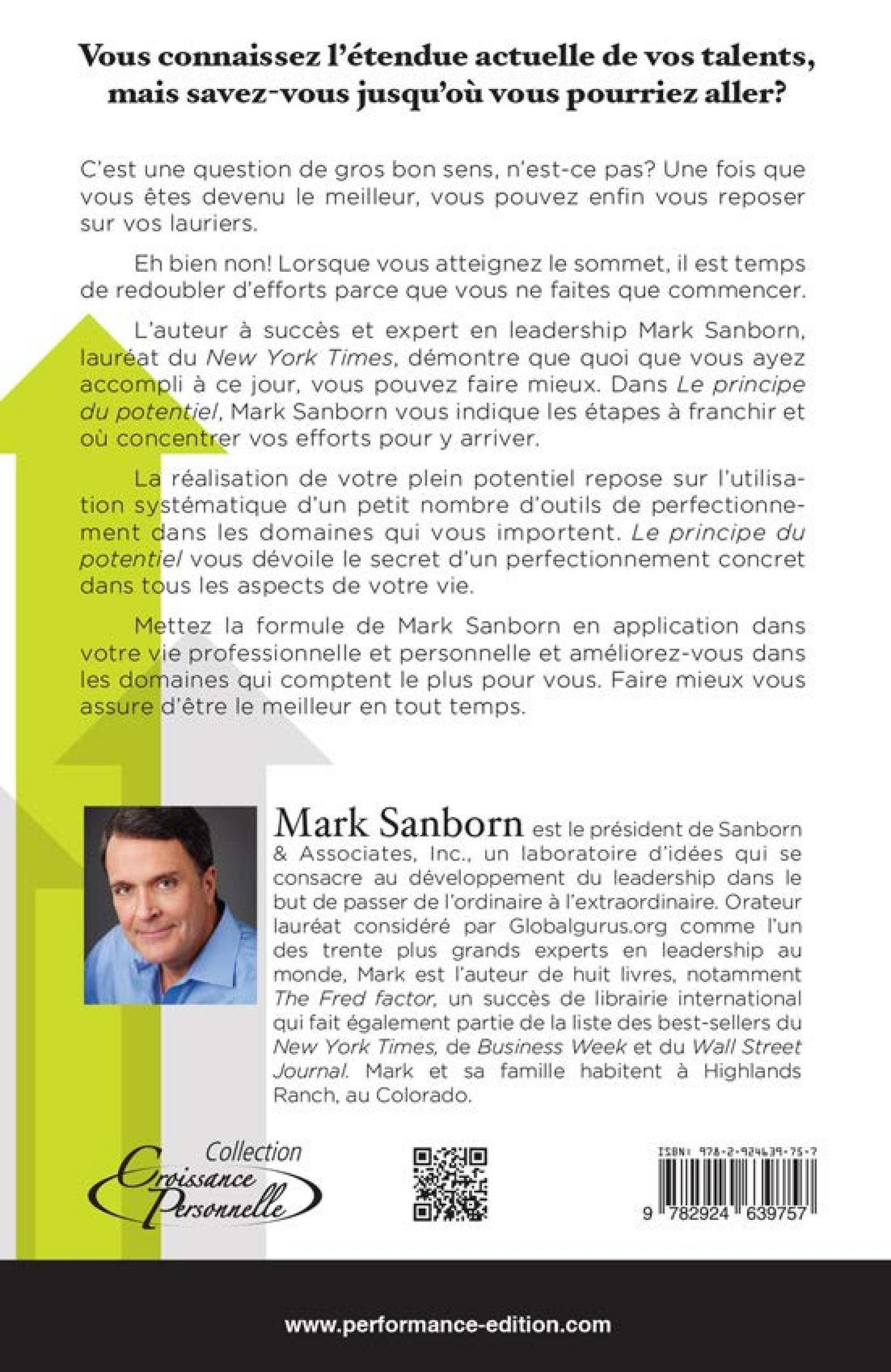 Vous connaissez l'étendue actuelle de vos talents, mais savez-vous jusqu'où vous pourriez aller ?C'est une question de gros bon sens, n'est-ce pas ? Une fois que vous êtes devenu le meilleur, vous pouvez enfin vous reposer sur vos lauriers.Eh bien non ! Lorsque vous atteignez le sommet, il est temps de redoubler d'efforts parce que vous ne faites que commencer.L'auteur à succès et expert en leadership Mark Sanborn, lauréat du New York Times, démontre que quoi que vous ayez accompli à ce jour, vous pouvez faire mieux. Dans Le principe du potentiel, Mark Sanborn vous indique les étapes à franchir et où concentrer vos efforts pour y arriver.La réalisation de votre plein potentiel repose sur l'utilisation systématique d'un petit nombre d'outils de perfectionnement dans les domaines qui vous importent. Le principe du potentiel vous dévoile le secret d'un perfectionnement concret dans tous les aspects de votre vie.Mettez la formule de Mark Sanborn en application dans votre vie professionnelle et personnelle et améliorez-vous dans les domaines qui comptent le plus pour vous. Faire mieux vous assure d'être le meilleur en tout temps.