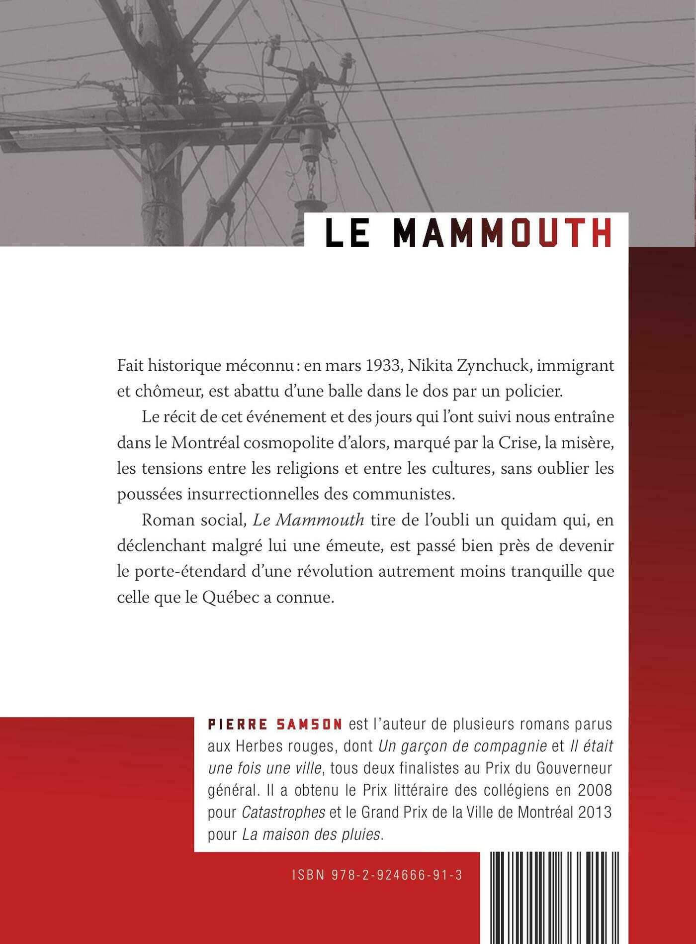 Fait historique méconnu : en mars 1933, Nikita Zynchuck, immigrant et chômeur, est abattu d’une balle dans le dos par un policier.Le récit de cet événement et des jours qui l’ont suivi nous entraîne dans le Montréal cosmopolite d’alors, marqué par la Crise, la misère, les tensions entre les religions et entre les cultures, sans oublier les poussées insurrectionnelles des communistes.Roman social, «Le Mammout» tire de l’oubli un quidam qui, en déclenchant malgré lui une émeute, est passé bien près de devenir le porte-étendard d’une révolution autrement moins tranquille que celle que le Québec a connue.Finaliste, Prix littéraire des collégiens 2021Finaliste, Grand Prix du livre de Montréal 2020Prix Jacob Isaac Segal 2020Finaliste, Prix des Libraires 2020, catégorie «roman québécois»Dans la présélection du Prix France-Québec 2020
