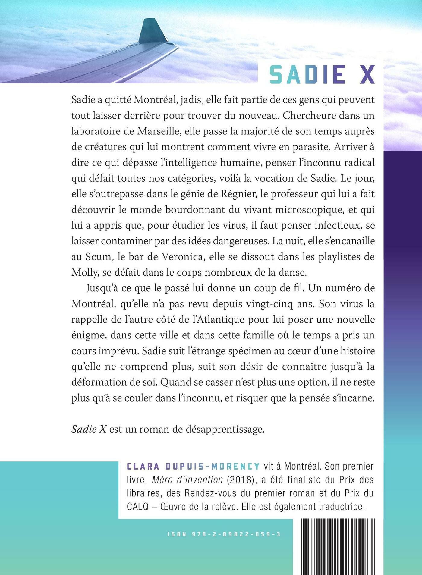 Sadie a quitté Montréal, jadis, elle fait partie de ces gens qui peuvent tout laisser derrière pour trouver du nouveau. Chercheure dans un laboratoire de Marseille, elle passe la majorité de son temps auprès de créatures qui lui montrent comment vivre en parasite. Arriver à dire ce qui dépasse l’intelligence humaine, penser l’inconnu radical qui défait toutes nos catégories, voilà la vocation de Sadie. Le jour, elle s’outrepasse dans le génie de Régnier, le professeur qui lui a fait découvrir le monde bourdonnant du vivant microscopique, et qui lui a appris que, pour étudier les virus, il faut penser infectieux, se laisser contaminer par des idées dangereuses. La nuit, elle s’encanaille au Scum, le bar de Veronica, elle se dissout dans les playlistes de Molly, se défait dans le corps nombreux de la danse. Jusqu’à ce que le passé lui donne un coup de fil. Un numéro de Montréal, qu’elle n’a pas revu depuis vingt-cinq ans. Son virus la rappelle de l’autre côté de l’Atlantique pour lui poser une nouvelle énigme, dans cette ville et dans cette famille où le temps a pris un cours imprévu. Sadie suit l’étrange spécimen au coeur d’une histoire qu’elle ne comprend plus, suit son désir de connaître jusqu’à la déformation de soi. Quand se casser n’est plus une option, il ne reste plus qu’à se couler dans l’inconnu, et risquer que la pensée s’incarne. SADIE X est un roman de désapprentissage.