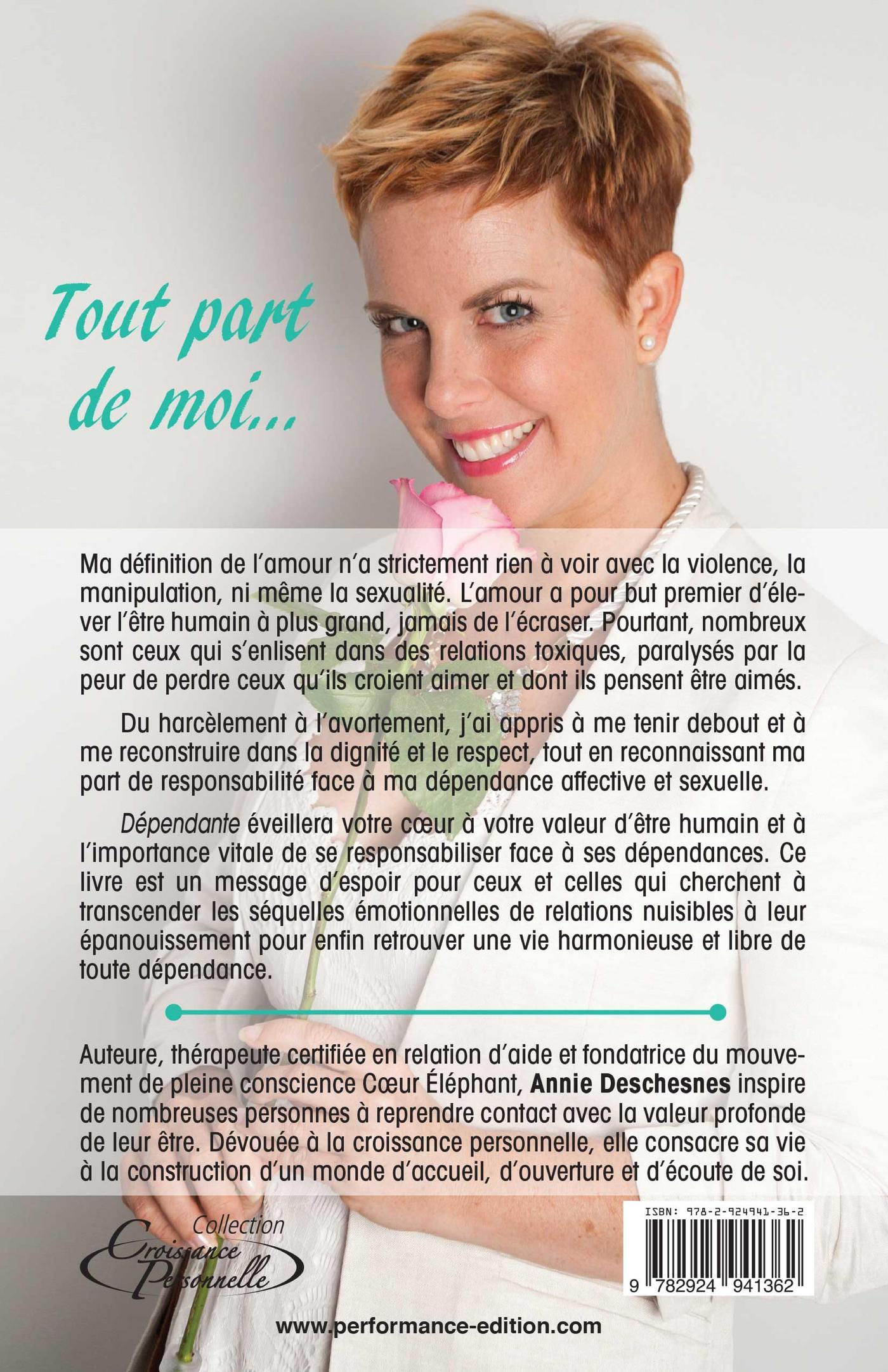 Ma définition de l'amour n'a strictement rien à voir avec la violence ou la manipulation. Dépendante dévoile avec transparence la descente aux enfers que j'ai connue avec un ancien conjoint. En plein coeur du chaos, j'ai dû comprendre les pièges de la dépendance affective et sexuelle qui m'ont poussée à me perdre dans cette relation toxique, destructrice et violente. Du harcèlement à l'avortement, j'ai appris à me tenir debout et à reconstruire ma vie dans la dignité, l'amour et le respect tout en reconnaissant ma part de responsabilité. Dépendante éveillera votre coeur à votre valeur d'être humain et à l'importance de choisir des relations saines pour vous-même. Ce livre est un message d'espoir pour ceux et celles qui cherchent à transcender les séquelles émotionnelles de relations nuisibles à leur épanouissement pour enfin retrouver une vie harmonieuse et libre de toute dépendance.