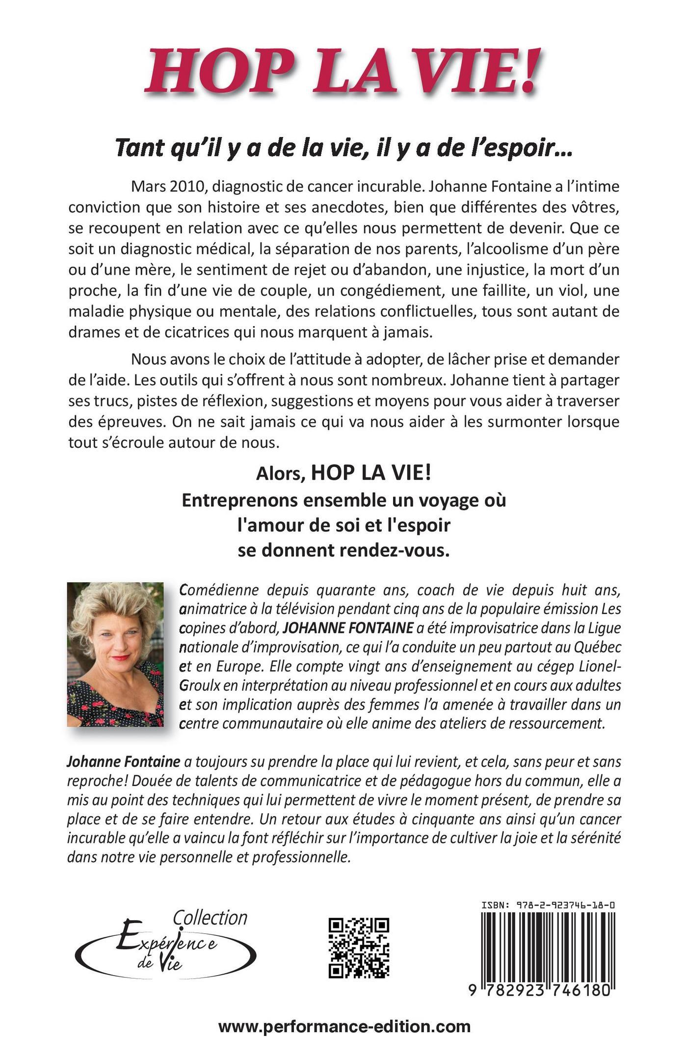 Tant qu'il y a de la vie, il y a de l'espoir… Mars 2010, diagnostic de cancer incurable. Que ce soit un diagnostic médical, la séparation de nos parents, l'alcoolisme d'un père ou d'une mère, le sentiment de rejet ou d'abandon, une injustice, la mort d'un proche, la fin d'une vie de couple,... tous sont autant de drames et de cicatrices qui nous marquent à jamais.Nous avons le choix de l'attitude à adopter, de lâcher prise et demander de l'aide. Les outils qui s'offrent à nous sont nombreux. Johanne Fontaine tient à partager ses trucs, pistes de réflexion, suggestions et moyens pour vous aider à traverser des épreuves. On ne sait jamais ce qui va nous aider à les surmonter lorsque tout s'écroule autour de nous. Entreprenons ensemble un voyage où l'amour de soi et l'espoir se donnent rendez-vous.