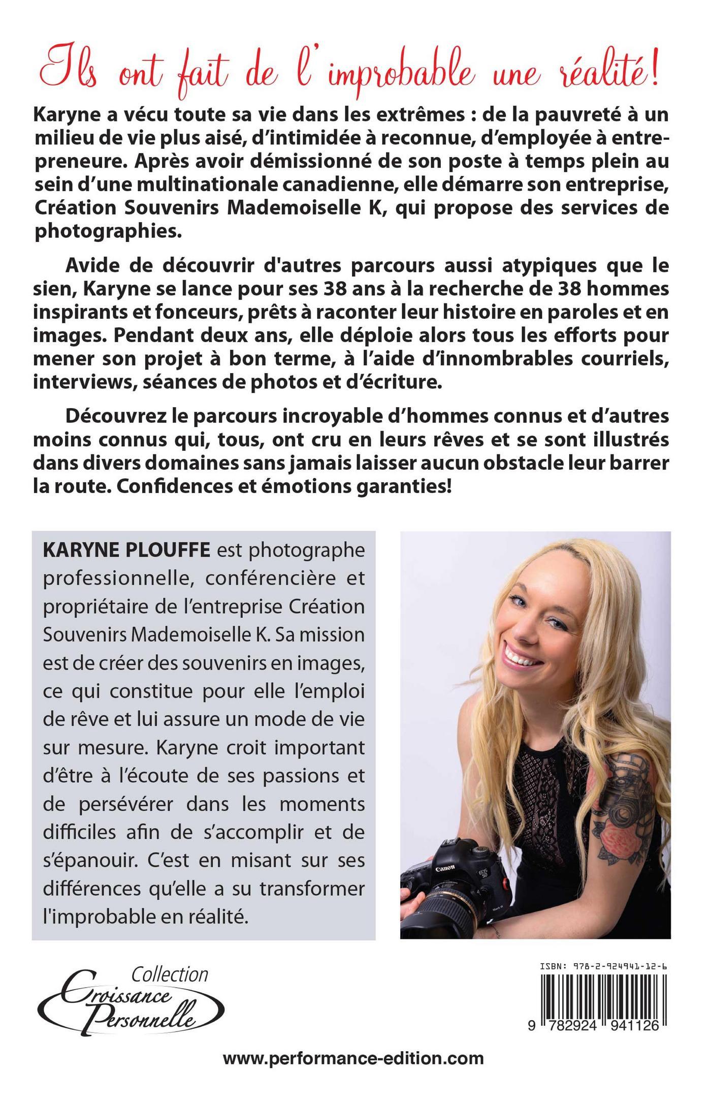 Karyne a vécu toute sa vie dans les extrêmes : de la pauvreté à un milieu de vie plus aisé, d'intimidée à reconnue, d'employée à entrepreneure. Après avoir démissionné de son poste à temps plein au sein d'une multinationale canadienne, elle démarre son entreprise, Création Souvenirs Mademoiselle K, qui propose des services de photographies. Avide de découvrir d'autres parcours aussi atypiques que le sien, Karyne se lance pour ses 38 ans à la recherche de 38 hommes inspirants et fonceurs, prêts à raconter leur histoire en paroles et en images. Pendant deux ans, elle déploie alors tous les efforts pour mener son projet à bon terme, à l'aide d'innombrables courriels, interviews, séances de photos et d'écriture. Découvrez le parcours incroyable d'hommes connus et d'autres moins connus qui, tous, ont cru en leurs rêves et se sont illustrés dans divers domaines sans jamais laisser aucun obstacle leur barrer la route. Confidences et émotions garanties! TÉMOIGNAGES DES HOMMES INSPIRANTS Gilles Vigneault, Philippe Laprise, Alexandre Despatie, Christian Marc Gendron, Patrick Côté, Étienne Boulay, Daniel Germain, Emmanuel Auger, Paul Sarrasin, Guy Michaud, Francois-Guy Thivierge, Dr Richard Payne et plusieurs autres, dont : CHRISTIAN GENESTPIERRE-OLIVIER LEBOEUF STÉPHANE BÉLANGER BENNY BROWN MARTIN DUTOU MARTIN LAMPRON BRUNO TORRES ANOULITH SINTHARAPHONE FRANCIS CHARRON JUSTIN KINGSLEY MARC DUMAINE CÉDRIC GOPALA-CÔTÉ ROBERT SAVOIE ALAIN MÉNARD DAVID MALENFANT ALEXANDRE GARIÉPY SAM RHOADS LUDOVIC BRÉANT SÉBASTIEN JACQUES MICHEL HUOT STEFAN FIGLIUZZI PAUL PYRONNETRAY JUNIOR COURTEMANCHE LOUIS LALONDE ROBIN BÉRUBÉ PAUL LAROCQUE