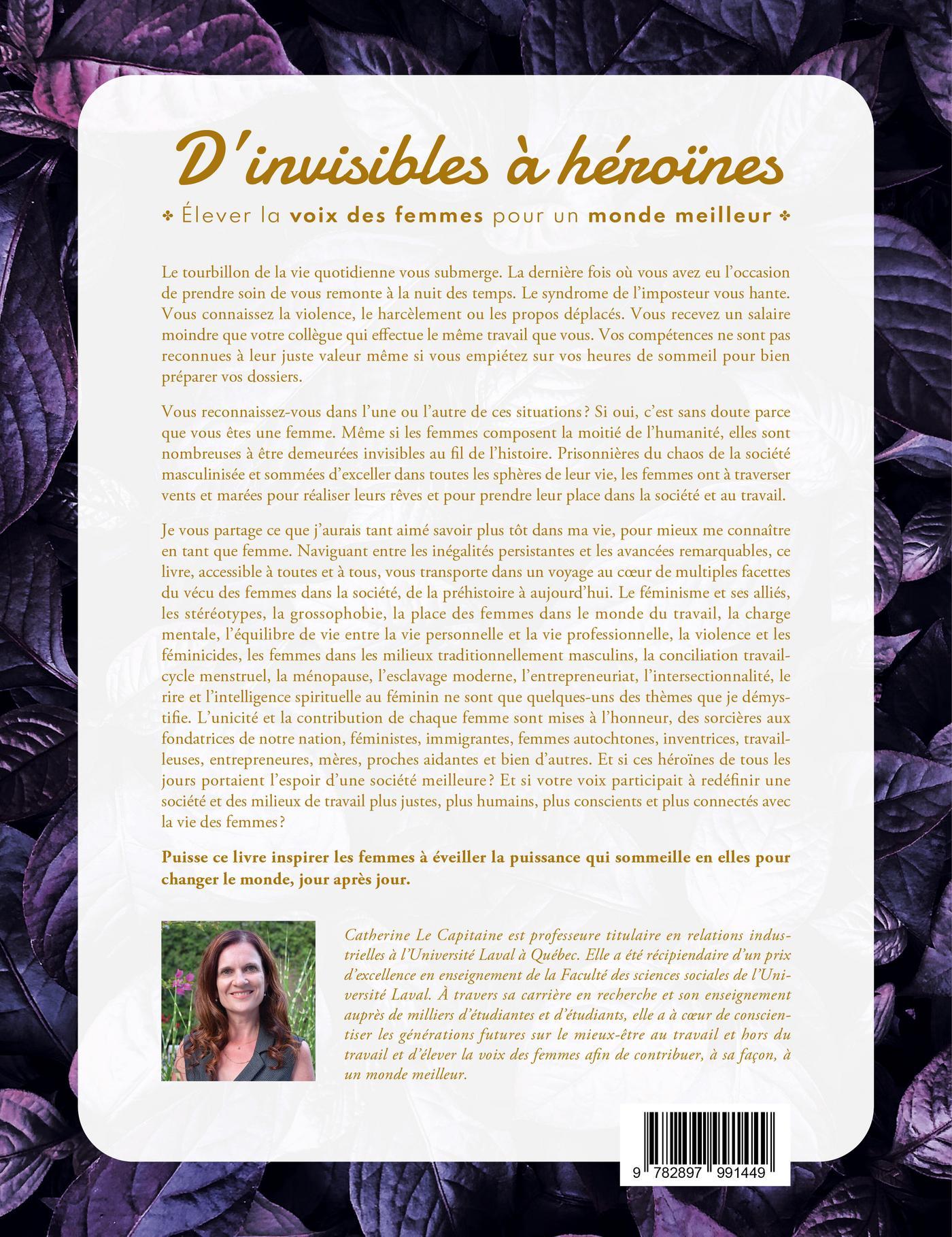 Le tourbillon de la vie quotidienne vous submerge. La dernière fois où vous avez eu l’occasion de prendre soin de vous remonte à la nuit des temps. Le syndrome de l’imposteur vous hante. Vous connaissez la violence, le harcèlement ou les propos déplacés. Vous recevez un salaire moindre que votre collègue qui effectue le même travail que vous. Vos compétences ne sont pas reconnues à leur juste valeur même si vous empiétez sur vos heures de sommeil pour bien préparer vos dossiers.Vous reconnaissez-vous dans l’une ou l’autre de ces situations ? Si oui, c’est sans doute parce que vous êtes une femme. Même si les femmes composent la moitié de l’humanité, elles sont nombreuses à être demeurées invisibles au fil de l’histoire. Prisonnières du chaos de la société masculinisée et sommées d’exceller dans toutes les sphères de leur vie, les femmes ont à traverser vents et marées pour réaliser leurs rêves et pour prendre leur place dans la société et au travail.Je vous partage ce que j’aurais tant aimé savoir plus tôt dans ma vie, pour mieux me connaître en tant que femme. Naviguant entre les inégalités persistantes et les avancées remarquables, ce livre, accessible à toutes et à tous, vous transporte dans un voyage au coeur de multiples facettes du vécu des femmes dans la société, de la préhistoire à aujourd’hui. Le féminisme et ses alliés, les stéréotypes, la grossophobie, la place des femmes dans le monde du travail, la charge mentale, l’équilibre de vie entre la vie personnelle et la vie professionnelle, la violence et les féminicides, les femmes dans les milieux traditionnellement masculins, la conciliation travail-cycle menstruel, la ménopause, l’esclavage moderne, l’entrepreneuriat, l’intersectionnalité, le rire et l’intelligence spirituelle au féminin ne sont que quelques-uns des thèmes que je démystifie. L’unicité et la contribution de chaque femme sont mises à l’honneur, des sorcières aux fondatrices de notre nation, féministes, immigrantes, femmes autochtones, inventrices, travailleuses, entrepreneures, mères, proches aidantes et bien d’autres. Et si ces héroïnes de tous les jours portaient l’espoir d’une société meilleure ? Et si votre voix participait à redéfinir une société et des milieux de travail plus justes, plus humains, plus conscients et plus connectés avec la vie des femmes ?Puisse ce livre inspirer les femmes à éveiller la puissance qui sommeille en elles pour changer le monde, jour après jour.