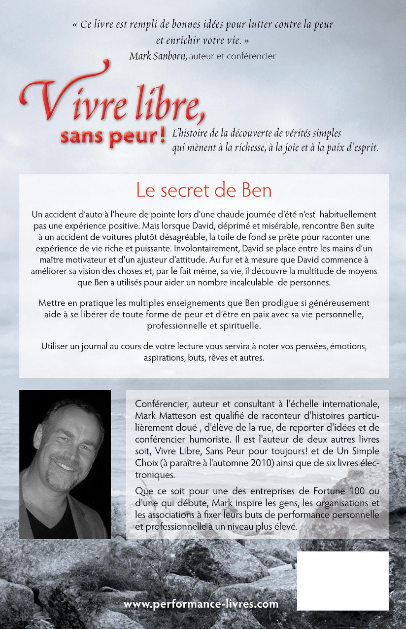 Un accident d’auto à l’heure de pointe lors d’une chaude journée d’été n’est habituellement pas une expérience positive. Mais lorsque David, déprimé et misérable, rencontre Ben suite à un accident de voitures plutôt désagréable, la toile de fond se prête pour raconter une expérience de vie riche et puissante. Involontairement, David se place entre les mains d’un maître motivateur et d’un ajusteur d’attitude. Au fur et à mesure que David commence à améliorer sa vision des choses et, par le fait même, sa vie. Il découvre la multitude de moyens que Ben a utilisés pour aider un nombre incalculable de personnes.Mettre en pratique les multiples enseignements que Ben prodigue si généreusement aide à se libérer de toute forme de peur et d’être en paix avec sa vie personnelle, professionnelle et spirituelle.Utiliser un journal au cours de votre lecture vous servira à noter vos pensées, émotions, aspirations, buts, rêves et autres.