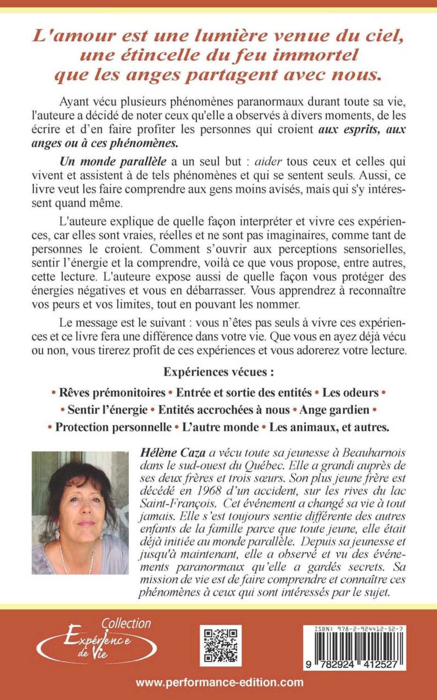 L'amour est une lumière venue du ciel,une étincelle du feu immortelque les anges partagent avec nous.Ayant vécu plusieurs phénomènes paranormaux durant toute savie, l'auteure a décidé de noter ceux qu'elle a observés à diversmoments, de les écrire et d'en faire profiter les personnes qui croientaux esprits, aux anges ou à ces phénomènes.Un monde parallèle a un seul but : aider tous ceux et celles quivivent et assistent à de tels phénomènes et qui se sentent seuls.Aussi, ce livre veut les faire comprendre aux gens moins avisés,mais qui s'y intéressent quand même.L'auteure explique de quelle façon interpréter et vivre ces expériences,car elles sont vraies, réelles et ne sont pas imaginaires,comme tant de personnes le croient. Comment s'ouvrir aux perceptionssensorielles, sentir l'énergie et la comprendre, voilà ce quevous propose, entre autres, cette lecture. L'auteure expose aussi dequelle façon vous protéger des énergies négatives et vous en débarrasser.Vous apprendrez à reconnaître vos peurs et vos limites, touten pouvant les nommer.Le message est le suivant : vous n'êtes pas seuls à vivre ces expérienceset ce livre fera une différence dans votre vie. Que vous en ayezdéjà vécu ou non, vous tirerez profit de ces expériences et vous adorerezvotre lecture.