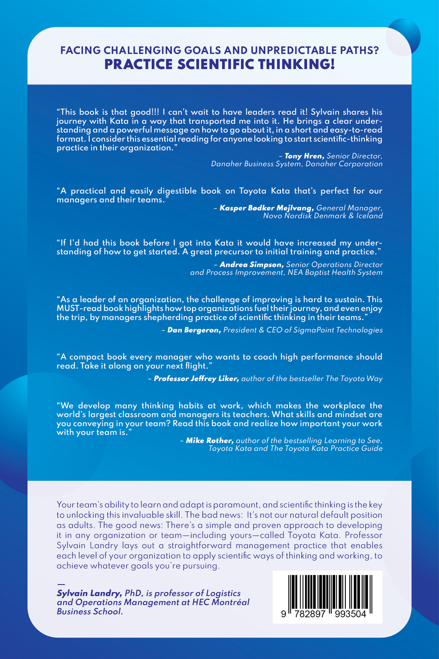 FACING CHALLENGING GOALS AND UNPREDICTABLE PATHS?PRACTICE SCIENTIFIC THINKING!Your team’s ability to learn and adapt is paramount, and scientific thinking is the key to unlocking this invaluable skill. The bad news: It's not our natural default position as adults. The good news: There’s a simple and proven approach to developing it in any organization or team—including yours—called Toyota Kata. Professor Sylvain Landry lays out a straightforward management practice that enables each level of your organization to apply scientific ways of thinking and working, to achieve whatever goals you’re pursuing.“This book is that good!!! I can’t wait to have leaders read it! Sylvain shares his journey with Kata in a way that transported me into it. He brings a clear understanding and a powerful message on how to go about it, in a short and easy-to-read format. I consider this essential reading for anyone looking to start scientific-thinking practice in their organization.”– Tony Hren, Senior Director,Danaher Business System, Danaher Corporation“A practical and easily digestible book on Toyota Kata that’s perfect for our managers and their teams.”– Kasper Bødker Mejlvang, General Manager,Novo Nordisk Denmark & Iceland"Sylvain Landry captures the essence of developing practical, everyday scientific thinking that powers up your team, intertwined with the fascinating psychology behind it."– Timothy McQueen, General Manager, GE Aviation“If I'd had this book before I got into Kata it would have increased my understanding of how to get started. A great precursor to initial training and practice.”– Andrea Simpson, Senior Operations Director and Process Improvement, NEA Baptist Health System“As a leader of an organization, the challenge of improving is hard to sustain. This MUST-read book highlights how top organizations fuel their journey, and even enjoy the trip, by managers shepherding practice of scientific thinking in their teams.”– Dan Bergeron, President & CEO of SigmaPoint Technologies“A compact book every manager who wants to coach high performance should read. Take it along on your next flight.”– Professor Jeffrey Liker, author of the bestseller The Toyota Way“We develop many thinking habits at work, which makes the workplace the world’s largest classroom and managers its teachers. What skills and mindset are you conveying in your team? Read this book and realize how important your work with your team is.”– Mike Rother, author of the bestselling Learning to See,Toyota Kata and The Toyota Kata Practice Guide